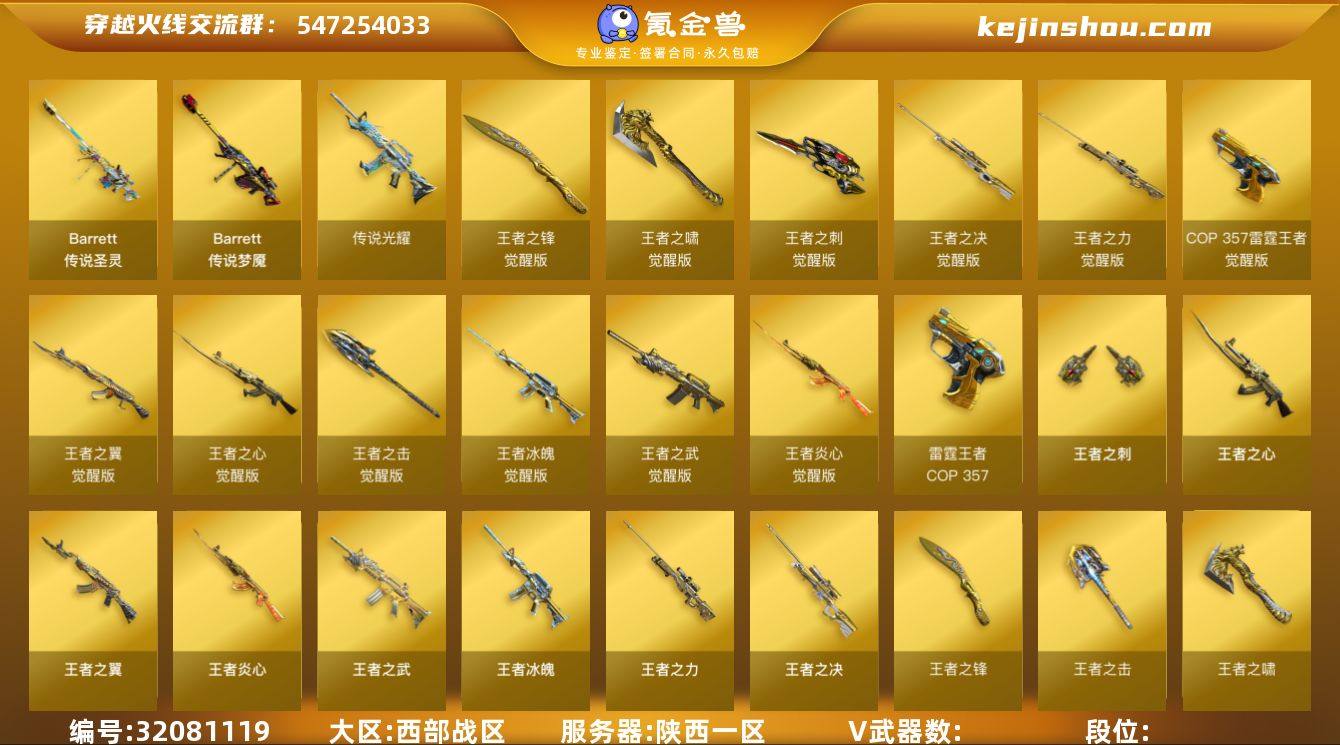 江西一区-43V-9王者-2炫金 【传说武器】:传说幽瞳,传说幽冥 【热门武器】:传说幽瞳,传说幽冥,G36C-幻影,QBZ03-金色蔷薇*2,M200-幻神*2,金色蔷薇-古蛇迷踪,修罗-古蛇迷踪,M200-竞技荣光,M4A1-黑骑士,白虎-枪娘安妮,沙鹰-修罗,炽芒蝶刃*2,炽芒蝶刃-破浪逐光 皮肤*2 【王者炫金武器】:王者雷影*2,王者星霆,炫金无影,炫金黑龙 【音效卡】:修罗-古蛇迷踪音效卡,AK47-火麒麟音效卡,M4A1-雷神音效卡,死神-雪域霜狐-怀旧音效卡 【皮肤】:金色蔷薇-量子蔷薇 皮肤,AWM-裁决-凤灵皮肤,雷神-航星皮肤,火麒麟-白虎,火麒麟-巅峰荣耀,毁灭-星空,黑骑士-典雅胡桃 皮肤,幻影-破浪逐光 皮肤,龙啸-醒狮 皮肤,炽芒蝶刃-破浪逐光 皮肤*2 【角色】:隼,隐,王者沙漠玫瑰,雪域霜狐,蛇隐宗,奇洋探员,芳心审判者,飞虎队-X,风暴女,荆棘玫瑰,兰妹妹,猎狐者-追月,灵狐-花神,龙儿,麻雀,曼陀罗-礼服,蛇姬,蜀雪,维纳斯,雪莉杨,雪莉杨-摸金校尉 【人偶武器】:天龙-曼陀罗,白虎-枪娘安妮,迷你宝贝,Scar Light-马枪,迷你裂空之翼,迷你牛牛,沙鹰-夜玫瑰 【暴走生化】:超级对讲机 【英雄级武器】:AK47-火麒麟,M4A1-黑龙,M4A1-雷神,M4A1-黑骑士,AK47-无影,G36C-幻影,黑武士-锦绣游龙,超新星-热带奇洋,金色蔷薇-古蛇迷踪,死神-雪域霜狐,QBZ03-金色蔷薇*2,王者之翼-觉醒版,王者冰魄-觉醒版,王者火魄-觉醒版,王者风势-觉醒版,Barrett-毁灭,AWM-裁决,M200-幻神*2,M200-竞技荣光,Barrett-金色蔷薇,王者凰鸣-觉醒版,AA-12-雷霆,王者之霆-觉醒版,沙鹰-修罗,沙鹰-天神*3,柯尔特-竞技荣光,修罗-古蛇迷踪,龙啸,麒麟刺,擎天-竞技荣光,炽芒蝶刃*2,龙啸-热带奇洋,高爆手雷-竞技荣光*6,手雷-热带奇洋,高爆手雷-古蛇迷踪,闪光弹-竞技荣光*3,烟雾弹-竞技荣光*4,烟雾...
