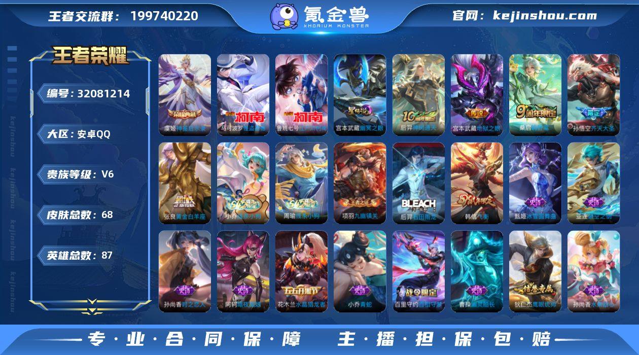 贵族等级:V6 典藏皮肤数:1 珍品无双皮肤数:0 无双皮肤数:0 珍品传说皮肤数:2 传说皮肤数:5 史诗皮肤数:23 皮肤数:68 英雄数:87 段位:荣耀王者 卖家说:可以讲价