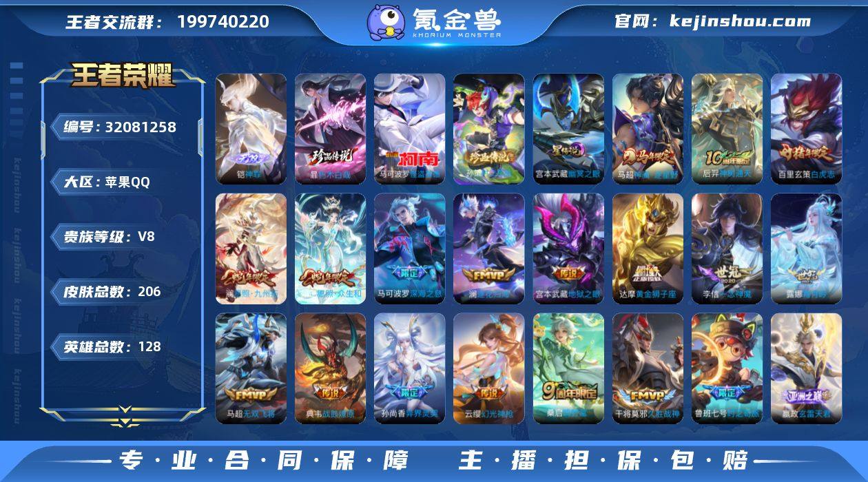 【秒换绑】苹果Q-V8-最强王者段位-128英雄-206皮肤-1无双-3珍品传说-23传说-60史诗 【英雄全皮】:孙权全皮,敖隐全皮,空空儿全皮,影全皮 【无双皮肤】:铠神罪 【珍品传说】:暃朽木白哉,孙策时之奇旅,马可波罗怪盗基德 【传说皮肤】:马超神骥逐星野,后羿神树通天,妲己愿照众生和,澜愿照九州拓,云缨幻光神枪,嬴政玄雷天君,桑启鸣野蒿,典韦战鼓燎原,澜逐花归海,露娜霜月吟,鲁班七号时之奇旅,兰陵王影龙天霄,东皇太一灼幽烈阳,马可波罗深海之息,马超无双飞将,孙尚香异界灵契,虞姬启明星使,李信一念神魔,干将莫邪久胜战神,达摩黄金狮子座,百里玄策白虎志,梦奇胖达荣荣,宫本武藏地狱之眼 【限定皮肤】:姜子牙天穹之誓,李白谪仙醉月,狄仁杰阴阳师,赵云皇家上将,孙尚香异界灵契,鲁班七号时之奇旅,元歌云间偶戏,元歌无心,马可波罗暗影游猎,马可波罗深海之息,马可波罗山海玄木吟,狄仁杰魔术师,达摩沙漠行僧,项羽海滩派对,老夫子航海奇遇记,韩信傲雪梅枪,兰陵王影龙天霄,孙悟空至尊宝,孙悟空孙行者,刘备百相守梦,李元芳云中旅人,虞姬启明星使,干将莫邪冰霜恋舞曲,干将莫邪胡桃夹子,雅典娜单词大作战,百里玄策白虎志,沈梦溪大漠名商,裴擒虎李小龙,裴擒虎擒涛扼浪,鲁班大师探海日志,桑启海盐诗旅,张良古海寻踪,鬼谷子天穹祈灯,沈梦溪龙舞盛年 【年限皮肤】:百里玄策白虎志,马可波罗山海玄木吟,妲己愿照众生和,澜愿照九州拓 【赛季限定】:达摩沙漠行僧,沈梦溪大漠名商,李元芳云中旅人,桑启海盐诗旅,裴擒虎擒涛扼浪,鲁班大师探海日志,张良古海寻踪,鬼谷子天穹祈灯,姜子牙天穹之誓,东皇太一噬灭天穹,太乙真人谧流熔炉,钟馗虚灵犬护,甄姬逆浪荇歌,亚瑟荣光之誓,项羽九幽镇关 【战令限定】:马可波罗暗影游猎,雅典娜单词大作战,元歌云间偶戏...
