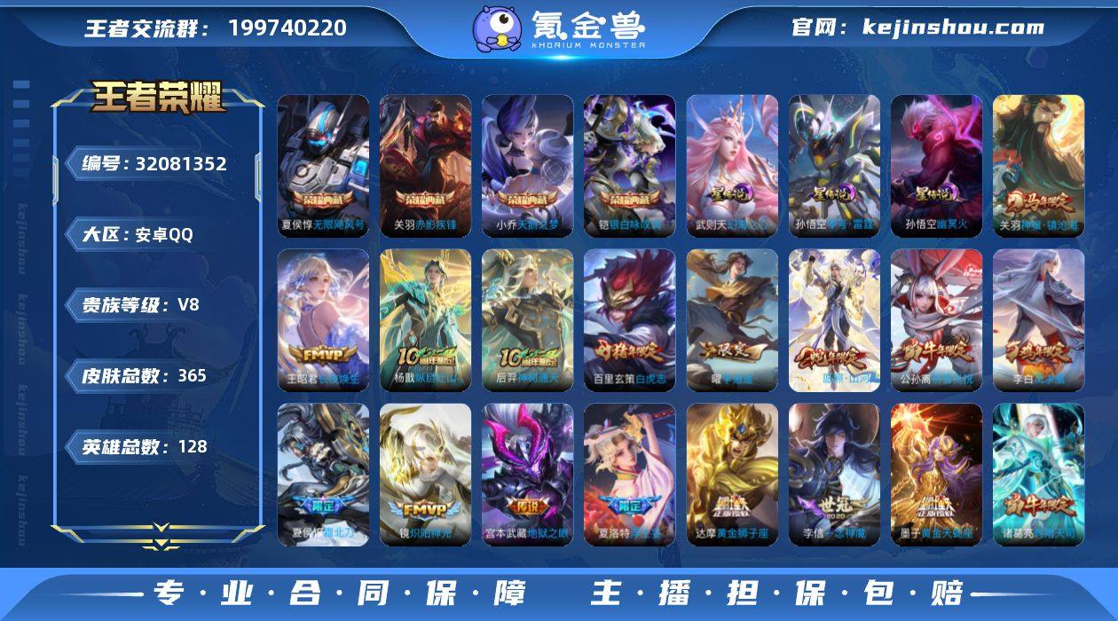 贵族等级:V8 典藏皮肤数:4 珍品无双皮肤数:0 无双皮肤数:0 珍品传说皮肤数:0 传说皮肤数:32 史诗皮肤数:112 皮肤数:365 英雄数:128 段位:非凡王者