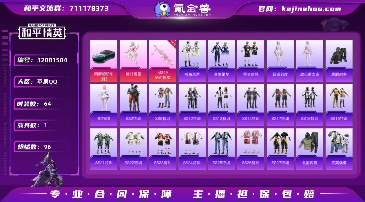 苹果 手Q-1粉装-1特效枪-1载具-1粉色飞行器-28426热力值-1王牌印记-64套装-96枪皮 【粉色套装】:角色-绝对恒星 【粉色枪皮等级】:M249-绝对恒星(六级) 【粉色载具】:阿斯顿马丁DBS(绿) 【粉色枪皮】:M249-绝对恒星 【粉色飞行器】:绝对恒星飞行器 【粉色降落伞】:绝对恒星降落伞,炫光之旅降落伞,圣堂之誓降落伞,蜜语绒猫降落伞,无垠阁降落伞,炫彩糖果降落伞,罪夜之冕降落伞 【稀有套装】:角色-超感刻度,角色-甜心蒙太奇,套装-雪国风尚,角色-都市丽猫,套装-书海巡游,套装-画境星梦,套装-琴音绮想 【稀有枪皮】:AKM-四圣焕新,AKM-影袭,AKM-破晓战魂,AKM-虎虎生威,AKM-龙的传人,M16A4-红色方程式,M16A4-蓝色火焰,SCAR-L-夜灯,SCAR-L-炫彩节奏,SCAR-L-玉兔迎春,SCAR-L-红色方程式,M416-红色方程式,M416-蓝色火焰,GROZA-影袭,GROZA-懵萌河马,AUG-耀粉歌者,AUG-绝对恒星,QBZ-原初圣火,M762-牛气冲天,M762-镭射皇者,M762-登顶巅峰,G36C-懵萌河马,ACE32-画境星梦,UZI-啾咪啾咪,UZI-影袭,UZI-红色方程式,UMP45-夜灯,UMP45-生命誓言,UMP45-蓝色火焰,Vector-彩虹符号,Vector-生命誓言,汤姆逊-天降萌叽,汤姆逊-耀粉歌者,MP5K-画境星梦,Kar98K-红色方程式,M24-影袭,M24-炫彩节奏,AWM-不夜海上花,VSS-镭射皇者,Mini14-原初圣火,Mini14-耀粉歌者,QBU-锦绣火鲤,莫辛纳甘-懵萌河马,M1加兰德-画境星梦,S686-生命誓言,S686-红色方程式,S1897-镭射皇者,S12K-玩趣呆呆,S12K-破晓战魂,S12K-夜灯,AA12-G-画境星梦,M249-破晓战魂,M249-镭射皇者,DP-28-原初圣火,MG3-幻世战舞者,PKM-懵萌河马,P18C-原初圣火,突击盾牌-绝对恒星,平底锅-画境星梦 【其他套装】:套装-SS2特训,套装-SS9特训,套装-SS12特训,套装-SS13特训,套装-SS14特训,套装-SS17特训,...