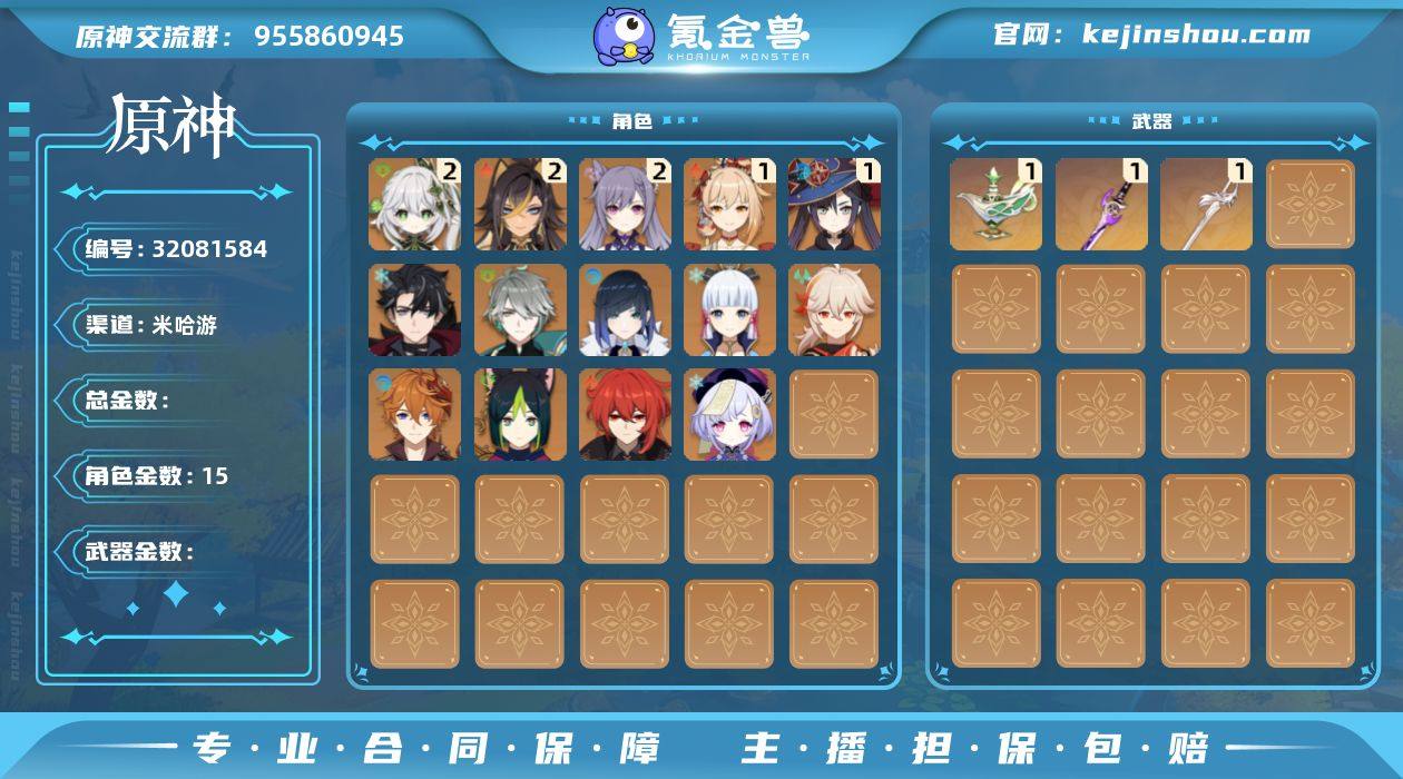 【金色角色】:莱欧斯利(0命),迪希雅(2命),艾尔海森(0命),纳西妲(2命),提纳里(0命),夜兰(0命),宵宫(1命),神里绫华(0命),枫原万叶(0命),达达利亚(0命),刻晴(2命),迪卢克(0命),莫娜(1命),七七(0命) 【拥有武器】:千夜浮梦(精1),雾切之回光(精1),风鹰剑(精1) 【紫色角色】:夏洛蒂(1命),琳妮特(2命),卡维(0命),米卡(3命),瑶瑶(4命),珐露珊(2命),莱依拉(满命),坎蒂丝(满命),多莉(4命),柯莱(3命),鹿野院平藏(4命),久岐忍(0命),云堇(1命),五郎(1命),托马(0命),九条裟罗(0命),烟绯(3命),罗莎莉亚(2命),辛焱(0命),迪奥娜(2命),砂糖(3命),雷泽(5命),菲谢尔(1命),丽莎(0命),北斗(满命),香菱(3命),安柏(0命),班尼特(满命),行秋(4命),芭芭拉(4命),凝光(0命),诺艾尔(满命),凯亚(0命)
