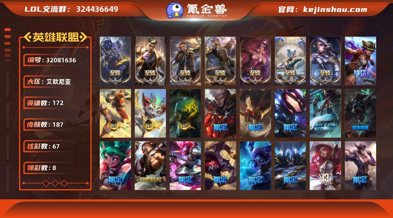 铂金段位-172英雄-187皮肤-67炫彩-0终极-9神话-37限定-21传说-25史诗【神话皮肤】:十五周年纪念希维尔,神凰行者瑞羽圣凰艾尼维亚,至臻西部魔影伊芙琳,至臻剪纸仙灵希维尔,至臻灵能特工伊泽瑞尔,至臻源计划逆流塞拉斯,至臻玉剑传说琴仙子【至臻皮肤】:至臻剪纸仙灵希维尔,至臻西部魔影伊芙琳,至臻玉剑传说琴仙子娑娜,至臻灵能特工伊泽瑞尔,至臻T1杰斯,至臻魔域梦魇泽丽,至臻源计划逆流塞拉斯【臻彩皮肤】:吕布奉先炫金战神,西部魔影卢锡安贝利尔之怠,天煞劫恒星游历者,西部天使赛娜神选天使长,星之守护者金克丝黑洞,星之吞噬者莫甘娜热情之末,可爱可爱粉红红布里茨,魔女阿卡丽虚荣【年限皮肤】:龙的传人李青,天龙之子伊泽瑞尔,天龙之子斯莫德【冰雪限定】:圣诞狂欢努努和威朗普,魄罗骑士瑟庄妮【限定皮肤】:地底世界崔斯特,冠军典狱长锤石,冠军掠夺者卡兹克,暗杀星蒙多,SSW雷恩加尔,SKTT1瑞兹,SKTT1奥拉夫,SKTT1烬,iG乐芙兰,女帝厄运小姐,暗裔英雄盖伦,胜利机器人布里茨,胜利之王泰达米尔,胜利巨口克格莫,胜利女神娑娜,胜利剑圣易,胜利之运崔斯特,南瓜头费德提克,魅惑女巫崔丝塔娜,魅惑女巫厄运小姐,暗影沃里克,奥德赛吉格斯,野兽猎人德莱文,波比的巧克力工坊,电玩战魂赫卡里姆,都铎王朝图奇,战场BOSS吉格斯,征服者阿利斯塔,征服者韦鲁斯,海之歌艾希,海之歌萨勒芬妮【传说皮肤】:霸天零式赛恩,日蚀骑士希维尔,合金巨兽努努和威朗普,西部天使艾希,律政大亨蒙多,灵能特工娑娜,战斗学院凯特琳,陆地王者4WD布里茨,源计划泯灭雷克顿,神拳李青,驯龙学者黑默丁格,暗星女王拉克丝,宇航员诺提勒斯,泳池派对吉格斯,金牌主播德莱文,神王德莱厄斯,暗星尊烬,星之守护者金克丝,西部天使赛娜,西部魔影卢锡安,真实伤害艾克【史诗皮肤】:圣光审判...