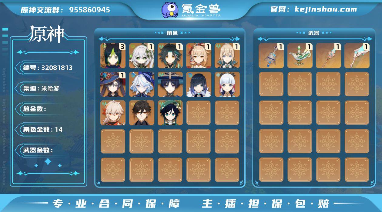 【金色角色】:芙宁娜(0命),流浪者(0命),纳西妲(1命),提纳里(3命),夜兰(0命),宵宫(1命),神里绫华(0命),枫原万叶(0命),魈(1命),钟离(0命),温迪(0命),琴(1命),莫娜(1命) 【拥有武器】:图莱杜拉的回忆(精1),千夜浮梦(精1),天空之脊(精1),天空之翼(精1) 【紫色角色】:琳妮特(0命),绮良良(1命),卡维(0命),米卡(0命),珐露珊(1命),莱依拉(2命),坎蒂丝(1命),多莉(1命),柯莱(满命),鹿野院平藏(4命),久岐忍(4命),云堇(4命),五郎(3命),托马(3命),九条裟罗(1命),早柚(满命),烟绯(3命),罗莎莉亚(1命),辛焱(4命),迪奥娜(5命),砂糖(2命),雷泽(满命),菲谢尔(满命),丽莎(2命),北斗(满命),香菱(3命),安柏(2命),班尼特(满命),行秋(4命),芭芭拉(5命),凝光(3命),诺艾尔(5命),凯亚(0命),重云(1命)
