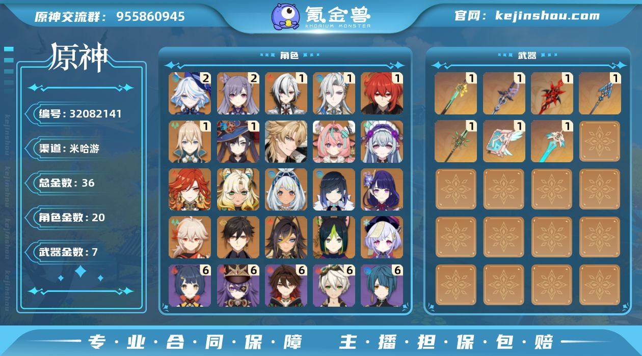 邮箱: 未绑定 总黄数: 36 冒险等级: 58 2命金色角色: 二命刻晴,二命芙宁娜 1命金色角色: 一命迪卢克,一命莫娜,一命琴,一命那维莱特,一命阿蕾奇诺 0命金色角色: 枫原万叶,七七,钟离,雷电将军,夜兰,提纳里,迪希雅,玛拉妮,希诺宁,玛薇卡,梦见月瑞希,瓦雷莎,法尔伽 拥有武器: 天空之卷,和璞鸢,天空之刃,息灾,赤月之形,赦罪,岩峰巡歌 1精武器: 天空之卷,和璞鸢,天空之刃,息灾,赤月之形,赦罪,岩峰巡歌