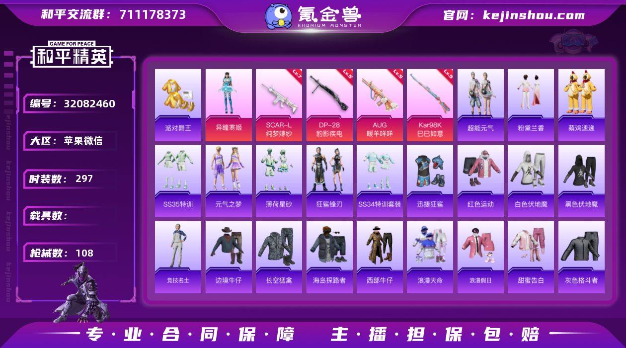 实名: 可修改 时装数: 297 枪械数: 108 热门装扮: 迅捷狂鲨,派对舞王,异瞳寒姬 稀有枪皮: SCAR-L纯梦嫁纱,Kar98K-巳巳如意,AUG-暖羊咩咩,DP-28-豹影疾电 亮点: 【优质装备】:派对舞王(小金鞋),舞王派对(派对舞王、小金鞋),暗影哥特(红眼罩),七级SCAR-L-纯梦嫁纱