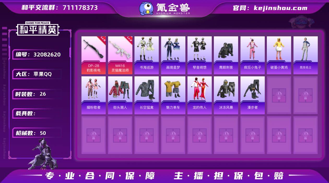 无二次-苹果 手Q-4特效枪-0载具-2粉色飞行器-13598热力值-2王牌印记-26套装-50枪皮 【粉色枪皮等级】:M416-灵猫魔法师(三级),AKS-74U-森灵之息(五级),Mk14-福马献瑞(五级),DP-28-豹影疾电(五级) 【粉色枪皮】:M416-灵猫魔法师,AKS-74U-森灵之息,Mk14-福马献瑞,DP-28-豹影疾电 【粉色飞行器】:沙丘之主天马,幻海精灵飞行器 【粉色降落伞】:星之彼岸降落伞,洛神天依降落伞,精灵之光降落伞 【稀有套装】:套装-马上有钱,套装-书海巡游,套装-画境星梦,套装-琴音绮想,角色-月烬之祷,套装-雨过天青,套装-红釉青花 【稀有枪皮】:M16A4-幻世战舞者,GROZA-影袭,AUG-甜蜜菠萝,ACE32-画境星梦,UZI-影袭,UZI-炫彩节奏,汤姆逊-天降萌叽,汤姆逊-像素花束,MP5K-画境星梦,Kar98K-影袭,Kar98K-洛神天依,M24-影袭,SKS-炫彩节奏,M1加兰德-画境星梦,S12K-极意拳锋,AA12-G-画境星梦,M249-星之彼岸,DP-28-彩虹符号,MG3-幻世战舞者,平底锅-画境星梦 【其他套装】:套装-疯狂小兔子,套装-破蛋小黄鸡,套装-竞技名士,套装-耀粉歌者,套装-街头潮人,套装-长空猛禽,套装-魅力单车,套装-龙的传人,套装-鹰眼刺客,套装-冰冻风暴,套装-漫步者 【营地ID】:1042477624