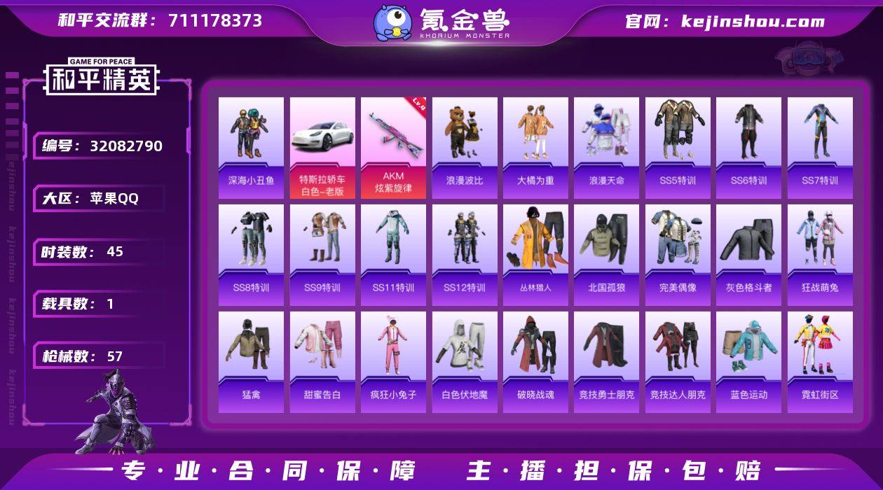 【HPN2001】45套装/枪械1/装备62/载具1/战备43/热力值16918/四级AKM-炫紫旋律/浪漫天命/深海小丑鱼/浪漫波比/特斯拉Model 3(珍珠白)/AKM炫紫旋律/神秘黑猫降落伞/AKM-霓虹街区/M16A4-机械英豪/M16A4-生命誓言/SCAR-L-甜蜜誓约/SCAR-L-红色方程式/M416-红色方程式/GROZA-黑色刀锋/QBZ-彩虹符号/QBZ-神秘黑猫/M762-快乐主宰/M762-牛气冲天/UZI-众神之王/UZI-生命誓言/UMP45-快乐主宰/UMP45-生命誓言/Vector-PEL轰鸣竞梦者/Vector-彩虹符号/Vector-生命誓言/野牛-机械英豪/MP5K-众神之王/MP5K-繁花小夜曲/Kar98K-红色方程式/M24-众神之王/M24-冰封烈焰/VSS-繁花小夜曲/VSS-黑色刀锋/Mini14-金鼠迎春/Mini14-阿狸红/Win94-机械英豪/SLR-众神之王/S686-冰封烈焰/S686-深海曼妙/S686-生命誓言/S1897-神秘黑猫/S12K-机械英豪/P1911-冰封烈焰/SS5特训/SS6特训/SS7特训/SS8特训/SS9特训/SS11特训/SS12特训/丛林猎人/北国孤狼/完美偶像/灰色格斗者/狂战萌兔/猛禽/甜蜜告白/疯狂小兔子/白色伏地魔/破晓战魂/竞技勇士朋克/竞技达人朋克/蓝色运动/霓虹街区/青春校园/青羽突袭者/魅力单车/街舞之王/凛冬战士/雪山精英/雪山征服者/冰原使者/圣诞大吉/核芯基因/精神漫游/众神之王/智慧之神/PEL躁动竞梦者/大橘为重/机械英豪/机械征服者/神奈川冲浪里/暗夜契约/纯白誓言/甜蜜誓约头盔(1级)/九霄背包(1级)/折纸暴龙背包(3级)/智能音符智慧背包(3级)/智能音符智慧背包(2级)/智能音符智慧背包(1级)/深海曼妙背包(1级)/古堡领主背包(2级)