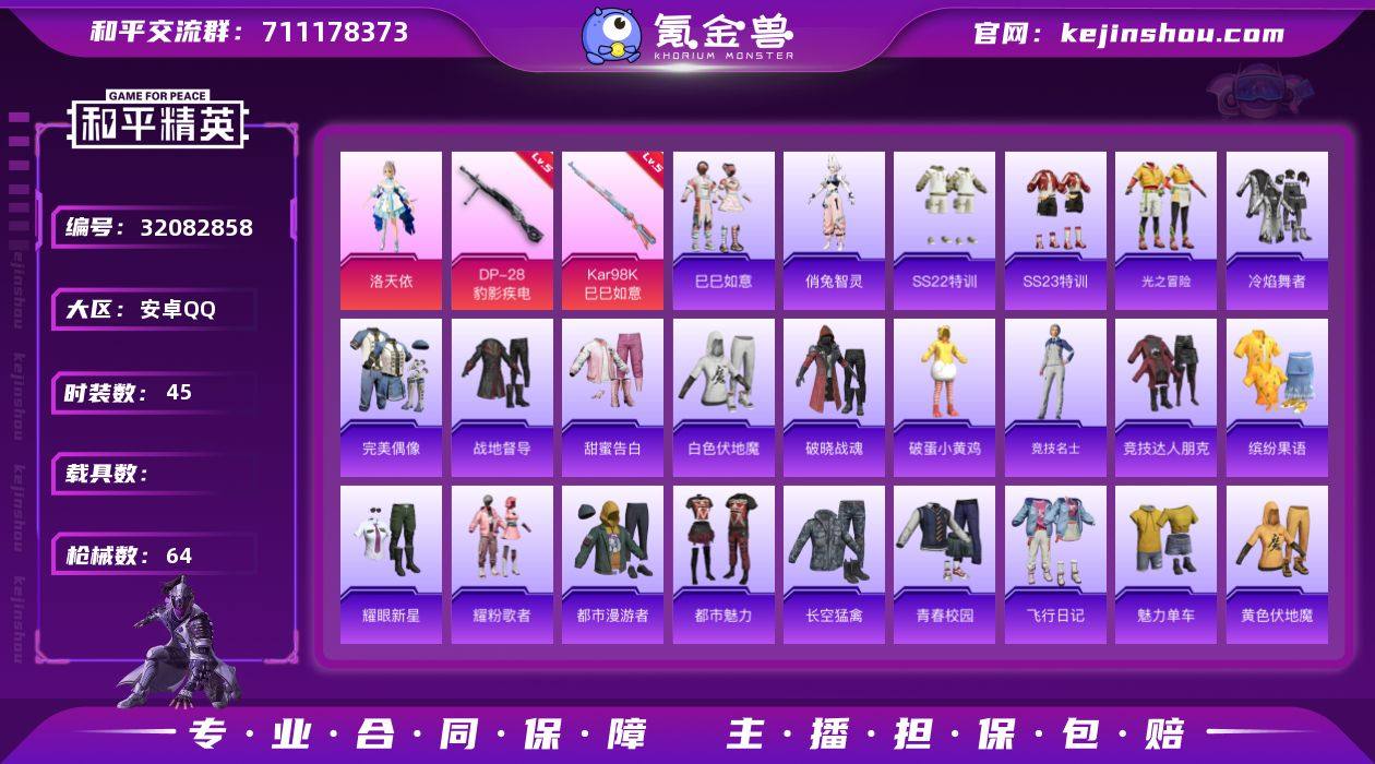 【HPN1954】45套装/枪械3/装备58/战备42/王牌印记1/热力值17455/五级Kar98K-巳巳如意/五级Mk14-福马献瑞/五级DP-28-豹影疾电/洛天依/Kar98K-巳巳如意/Mk14-福马献瑞/DP-28-豹影疾电/炫彩糖果飞行器/绯穹魔姬降落伞/炫彩糖果降落伞/虹云熊熊降落伞/巳巳如意/套装-马上有钱/俏兔智灵/AKM-彩虹符号/AKM-破晓战魂/SCAR-L-玉兔迎春/M416-糯团青竹/M416-蓝色火焰/AUG-天降萌叽/AUG-耀粉歌者/QBZ-彩虹符号/M762-天降萌叽/蜜獾-天降萌叽/UZI-天降萌叽/UZI-月影灵韵/Vector-暗夜玫瑰/Vector-生命誓言/P90-巳巳如意/SKS-炫彩节奏/SKS-糯团青竹/Mini14-炫彩节奏/SLR-彩虹符号/S12K-玩趣呆呆/S12K-夜灯/DBS-月影灵韵/M249-糯团青竹/破片手榴弹-巳巳如意/SS22特训/SS23特训/光之冒险/冷焰舞者/完美偶像/战地督导/甜蜜告白/白色伏地魔/破晓战魂/破蛋小黄鸡/竞技名士/竞技达人朋克/缤纷果语/耀眼新星/耀粉歌者/都市漫游者/都市魅力/长空猛禽/青春校园/飞行日记/魅力单车/黄色伏地魔/黄色名流/黑色伏地魔