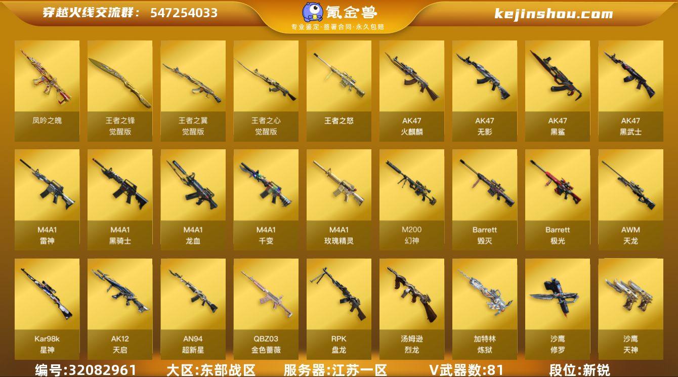 江苏一区-90V-12王者武器数-0炫金武器数 【传说角色】:传说艾莉莎 【热门武器】:G36C-幻影,QBZ03-金色蔷薇,M200-幻神,死亡之眼,凤吟之魄,荣耀世冠-火麒麟,荣耀世冠-雷神,柯尔特-冠军之特*3,荣耀世冠-柯尔特,Kar98K-星神,M4A1-黑骑士*6,汤姆逊-烈龙*6,RPK-盘龙*6,加特林-炼狱*2,斯泰尔-蝴蝶,炼狱-枪娘掣电,白虎-枪娘安妮,USP-雷暴,沙鹰-修罗*5,Knife-冠军之刃,金刚伞 【王者炫金武器】:凤吟之魄,王者之怒,王者之魄高爆手雷*2,王者之魄闪光弹*3,王者之魄烟雾弹 【音效卡】:AK47-火麒麟音效卡,M4A1-雷神音效卡,M4A1-黑骑士音效卡 【皮肤】:幻神-冠军之幻,幻神-宠儿-2021MVP,QBZ03-冠军之薇,星神-破竹皮肤,雷神-暗月,雷神-能量核心,雷神-耀金皮肤,雷神-冠军之魄,雷神-宠儿-2019MVP,雷神-维纳斯皮肤,火麒麟-冠军之心,火麒麟-轻羽皮肤,火麒麟-盘古,火麒麟-百城,火麒麟-心动糖果,毁灭-冠军之怒,M4A1-千变-孔明皮肤,黑骑士-冠军之势,修罗-冠军之魂,屠龙-春桃 皮肤,麒麟刺-萌杀皮肤 【角色】:零,樱,晴雅,王者-零,王者沙漠玫瑰,炽天使,暗夜-X,风暴女,虎妞,嘉年华灵狐,灵狐-花神,灵狐者-X,灵狐者-黄金海岸,灵狐者-职业经理,龙儿,曼陀罗-X,女战神,潘多拉-X,潜龙队-X,青霞仙子,斯沃特-X,蜀雪,铁骑荣耀,维纳斯,雪莉杨-摸金校尉,夜玫瑰-幻能朋克,夜玫瑰-宠粉,影武者-X 【人偶武器】:白虎-枪娘安妮,炼狱-枪娘掣电,迷你宝贝,斯泰尔-蝴蝶,COP-旗袍,迷你生化手雷*3 【暴走生化】:双面神,死亡之眼 【挑战大师】:暴君乱世-超越Max,AK47-冰龙粉碎者,激光毁灭者III-白马银枪,激光毁灭者III,试炼破坏者III 【英雄级武器】:M4A1-千变*2,AK47-火麒麟*2,M4A1-雷神*2,M4A1-黑骑士*6,AK47-无影*2,AK47-黑武士,AK12-天启,AN94-超新星,AK4...