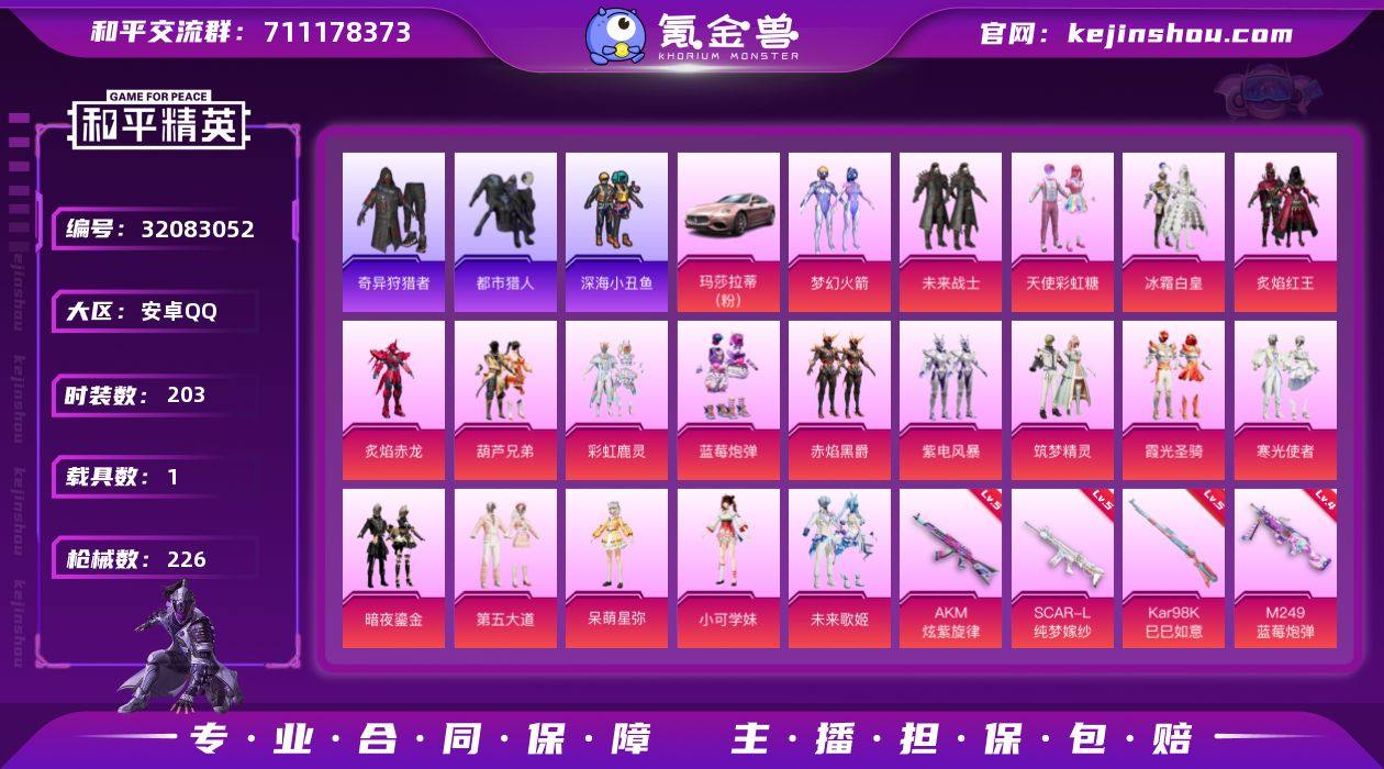 【1240】安卓 手Q-19粉装-7特效枪-1载具-2粉色飞行器-82172热力值-10王牌印记-203套装-226枪皮 【热门品类】:粉装-梦幻火箭,套装-浪漫天命,套装-都市猎人,套装-深海小丑鱼,套装-小丑鱼,套装-奇异狩猎者,套装-龟仙人,套装-暗影哥特,套装-粉红小猪 【粉色载具】:玛莎拉蒂Ghibli(粉) 【粉色套装】:粉装-未来战士,粉装-天使彩虹糖,粉装-梦幻火箭,粉装-冰霜白皇,粉装-炙焰红王,粉装-炙焰赤龙,粉装-葫芦兄弟,粉装-彩虹鹿灵,粉装-蓝莓炮弹,粉装-赤焰黑爵,粉装-紫电风暴,粉装-筑梦精灵,粉装-霞光圣骑,粉装-寒光使者,粉装-暗夜鎏金,粉装-第五大道,角色-呆萌星弥,角色-小可学妹,粉装-未来歌姬 【粉色枪皮等级】:AKM-炫紫旋律(五级),SCAR-L-纯梦嫁纱(五级),Kar98K-巳巳如意(五级),M417-第五大道(三级),M249-蓝莓炮弹(四级),MG3-洛神天依(四级),平底锅-仲夏莫吉托(三级) 【粉色枪皮】:AKM-炫紫旋律,SCAR-L-纯梦嫁纱,Kar98K-巳巳如意,M417-第五大道,M249-蓝莓炮弹,MG3-洛神天依,平底锅-仲夏莫吉托 【粉色飞行器】:梦幻火箭飞行器,风花雪月飞行器 【粉色降落伞】:快乐主宰降落伞,幻影战神降落伞,百万伏特降落伞,未来战士降落伞,甜心宝贝降落伞,梦幻火箭降落伞,烈焰拳霸降落伞,暗夜玫瑰降落伞,洛神天依降落伞,海渊国主降落伞,蓝莓炮弹降落伞,碧影闪光降落伞,橘柚倾心降落伞,筑梦精灵降落伞,炙焰牛王降落伞,圣光天使降落伞,妙趣可丽降落伞,暗夜鎏金降落伞,第五大道降落伞,飒粉甜心降落伞 【稀有套装】:套装-龟仙人,套装-巳巳如意 【稀有枪皮】:AKM-冰凉西瓜,AKM-彩虹符号,AKM-影袭,AKM-海渊国主,AKM-灼热熔岩,AKM-破晓战魂,AKM-萌趣颜团子,AKM-虎虎生威,AKM-霓虹街区,AKM-龙的传人,M16A4-幻世战舞者,M16A4-快乐主宰,M16A4-甜心亚梦,M16A4-红...