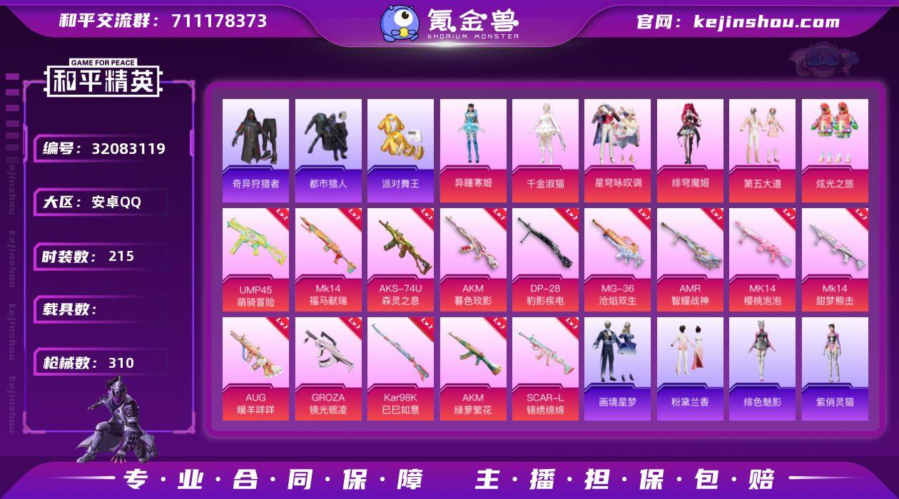 M1046715【身法号7粉装-14特效枪 暴走罗小黑,奇异狩猎者,浪漫天命,都市猎人,狂沙舞者,激萌罗小黑,派对舞王 AUG-暖羊咩咩[5级]】安卓手Q-7粉装-14特效枪-215套装-310枪皮-12王牌印记-荣耀皇冠Ⅰ-92123热力值【7粉装】炫光之旅,第五大道,星穹咏叹调,角色-千金淑猫,角色-异瞳寒姬,角色-绯穹魔姬,角色-花灵【14特效枪】MG-36-沧焰双生[5级],Mk14-樱桃泡泡[3级],UMP45-萌骑冒险[4级],Kar98K-巳巳如意[5级],DP-28-豹影疾电[5级],AKS-74U-森灵之息[5级],AKM-绿萝繁花[5级],Mk14-甜梦熊击[5级],Mk14-福马献瑞[5级],AUG-暖羊咩咩[5级],GROZA-镜光银凌[5级],AKM-暮色玫影[3级],SCAR-L-锦绣绵绵[5级],AMR-智耀战神[7级]【11稀有】暴走罗小黑,奇异狩猎者,浪漫天命,都市猎人,狂沙舞者,激萌罗小黑,派对舞王,M762-奇异狩猎者,S686-奇异狩猎者,M24-奇异狩猎者,AKM-奇异狩猎者【14飞行器】登顶巅峰飞行器,光之冒险尾迹,暮色之舞飞行器,顶峰精英尾迹,终晖之翼飞行器,鸡智如我飞行器,春暖花开飞行器,破刃行动尾迹,狂鲨锋刃飞行器,云朵驼驼飞行器,异域银装飞行器,空岛之星尾迹,炫彩糖果飞行器,招财竹蜻蜓飞行器【2头盔】梦幻火箭头盔,幻影战神头盔【1背包】幻影战神背包【493其它衣服和枪皮】大橘大利,SS37特训,炫彩糖果,SS36特训,淡雅花蕊,红釉青花,青玉碎影,SS28特训,火种守卫者,坚韧舞者,画境星梦,狙击之神,橘黑制服,幻世保卫者,SS22特训,SS33特训,深蓝色名流,特训学院,麻辣教官,擎苍青焰,森林游猎者,棉花软糖,雏菊兔兔,糖糖葫芦,璀璨流光,星影赞美诗,猛禽,黄色名流,福马献瑞,战地督导,冷焰舞者,SS27特训,千禧之恋,探宝勇士,都市漫游者,蓝海鲸歌,游乐,朱霞炽焰,莱茵河畔,星途旅人,血色贵族,快闪甜心,冰冻风暴,霓虹街区,元气发射,战术大师,锦衣飞扬,耀粉歌者,幽夜迷踪,角色-紫俏灵猫,惊鸿