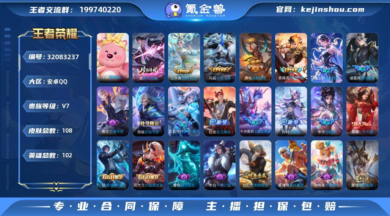 ·神骥逐星野·诡秘之主·踏浪归·星之鸣奏·愿照千秋盛·战鼓燎原·鹤羽星尊·云诺千山·绯月行·凤求凰·无双飞将·可二次】w17852-安卓Q-102英雄-108皮肤-6王者印记-130铭文-贵族积分2w【贵族7】【1珍品·13传说·12按键】【因赛季更新游戏段付以上号为准!】 【英雄全皮】:孙权全皮 【珍品传说】:暃朽木白哉 【传说皮肤】:韩信踏浪归,马超神骥逐星野,元歌诡秘之主,公孙离云诺千山,杨玉环星之鸣奏,女娲愿照千秋盛,裴擒虎祥瑞亨通,桑启鸣野蒿,典韦战鼓燎原,诸葛亮鹤羽星尊,不知火舞绯月行,马超无双飞将,李白凤求凰 【限定皮肤】:狄仁杰阴阳师,赵云皇家上将,嬴政优雅恋人,芈月白晶晶,元歌云间偶戏,狄仁杰魔术师,项羽海滩派对,程咬金演武夺筹,露娜一生所爱,不知火舞绯月行,钟馗驱傩正仪,干将莫邪冰霜恋舞曲,诸葛亮鹤羽星尊,蒙恬荣光圣徽,鬼谷子天穹祈灯 【年限皮肤】:李白凤求凰,女娲愿照千秋盛 【赛季限定】:程咬金演武夺筹,钟馗驱傩正仪,鬼谷子天穹祈灯,东皇太一噬灭天穹,太乙真人谧流熔炉,钟馗虚灵犬护,甄姬逆浪荇歌,亚瑟荣光之誓,蒙恬荣光圣徽,项羽九幽镇关 【战令限定】:元歌云间偶戏,周瑜百相守梦,孙策百相守梦,周瑜线条小狗 【史诗皮肤】:上官婉儿春霖将至,周瑜线条小狗,项羽九幽镇关,公孙离涂山容容,弈星守夜人,西施织梦人,黄忠百相守梦,云缨赞萌露比,周瑜百相守梦,百里守约雪豹霜爪,狂铁龙之律动,阿轲化蝶舞,蒙恬荣光圣徽,芈月白晶晶,元歌云间偶戏,狄仁杰鹰眼统帅,露娜一生所爱,干将莫邪冰霜恋舞曲,阿轲节奏热浪,程咬金功夫厨神,铠曙光守护者,夏侯惇乘风破浪,花木兰水晶猎龙者,李白千年之狐,曹操幽灵船长,妲己魅力维加斯,嬴政优雅恋人,孙尚香水果甜心,狄仁杰魔术师,王昭君偶像歌手,貂蝉圣诞恋歌,赵云皇家上将 【其他皮肤】:孙权径山谋...