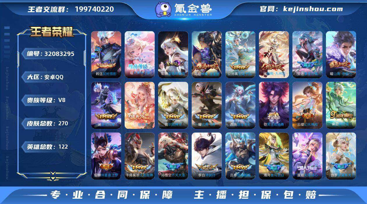 【秒换绑】安卓Q-V8-最强王者段位-122英雄-270皮肤-1典藏皮肤-1珍品传说-24传说-87史诗 【英雄全皮】:西施全皮,空空儿全皮,影全皮,海诺全皮 【荣耀典藏】:韩信弑枪猎影 【珍品传说】:瑶大耳狗之梦 【传说皮肤】:马超神骥逐星野,公孙离云诺千山,西施续相思,澜愿照九州拓,云缨幻光神枪,桑启鸣野蒿,铠冥王哈迪斯,海月金乌负日,亚连落雪白狼,澜逐花归海,花木兰燃星之曲,虞姬无限倾心,伽罗炽翼辉光,孙悟空齐天大圣,曜山海苍雷引,吕布怒海麟威,李白诗剑行,西施游龙清影,铠绛天战甲,镜炽阳神光,虞姬启明星使,曜云鹰飞将,干将莫邪久胜战神,貂蝉仲夏夜之梦 【限定皮肤】:铠冥王哈迪斯,暃埋骨钱,蒙犽顽岩魄,蔡文姬夏日便利店,大乔绒语心约,虞姬夏日便利店,姜子牙天穹之誓,李白谪仙醉月,狄仁杰阴阳师,赵云皇家上将,元歌云间偶戏,元歌无心,典韦蓝屏警告,马可波罗山海玄木吟,狄仁杰魔术师,项羽海滩派对,安琪拉魔法小厨娘,花木兰燃星之曲,孙悟空齐天大圣,李元芳云中旅人,虞姬启明星使,虞姬无限倾心,雅典娜单词大作战,公孙离玉兔公主,裴擒虎擒涛扼浪,瑶山海碧波行,伽罗炽翼辉光,嫦娥暖冬兔眠,曜山海苍雷引,西施玲珑珍味,西施至美乘鲤谣,鲁班大师探海日志,桑启海盐诗旅,暃星界游侠,鬼谷子天穹祈灯,姬小满妄想食味,大乔乘龙忆丹青,安琪拉乘龙聚宝船,亚连落雪白狼,沈梦溪龙舞盛年,鲁班七号蔬乡物语,李元芳蔬乡物语,海月金乌负日,刘邦剑破天穹,程咬金群星魔术团,关羽决胜骁骑,镜青焰无极,项羽苍威无极,海诺心动手记,刘备异域游侠,芈月浮光幕影,周瑜熔金海岸 【年限皮肤】:曜山海苍雷引,瑶山海碧波行,马可波罗山海玄木吟,大乔乘龙忆丹青,安琪拉乘龙聚宝船,澜愿照九州拓 【赛季限定】:李元芳云中旅人,桑启海盐诗旅,裴擒虎擒涛扼浪,鲁班大...