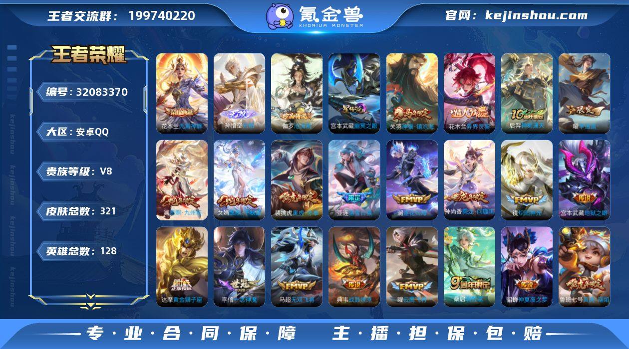 【精品推荐·九霄神辉·无相·沧流箭·李逍遥·寅虎赤拳·挚爱之约·神骥镇沧海·花木兰异界灵契·愿照千秋盛·愿照九州拓·乘龙问璇玑·寅虎瑞焰·挚爱童话天幕·可二次】YXw17965-安卓Q-128英雄-321皮肤-8王者印记-300铭文-贵族积分5w【贵族8】【1典藏·1无双·1珍品·1星传说·24传说·2天幕·14按键·幸运值145】【因赛季更新游戏段付以上号为准!】 【英雄全皮】:孙权全皮,鬼谷子全皮,敖隐全皮 【荣耀典藏】:花木兰九霄神辉 【无双皮肤】:孙悟空无相 【珍品传说】:伽罗沧流箭 【星元皮肤】:宫本武藏幽冥之眼 【天幕】:共赏芳华天幕,挚爱童话天幕 【传说皮肤】:关羽神骥镇沧海,花木兰异界灵契,后羿神树通天,女娲愿照千秋盛,澜愿照九州拓,桑启鸣野蒿,亚连落雪白狼,典韦战鼓燎原,孙尚香乘龙问璇玑,澜逐花归海,马超无双飞将,孙策挚爱之约,裴擒虎寅虎赤拳,鲁班七号寅虎瑞焰,赵云淬星耀世,曜李逍遥 ,镜炽阳神光,虞姬启明星使,曜云鹰飞将,李信一念神魔,达摩黄金狮子座,梦奇胖达荣荣,貂蝉仲夏夜之梦,宫本武藏地狱之眼 【限定皮肤】:蒙犽顽岩魄,姜子牙天穹之誓,狄仁杰阴阳师,廉颇寅虎御盾,赵云皇家上将,墨子神迹守卫,嬴政优雅恋人,孙尚香蔷薇恋人,鲁班七号寅虎瑞焰,庄周高山流水,白起夜都怪侠,芈月幻夜卜梦,元歌云间偶戏,甄姬游园惊梦,马可波罗暗影游猎,马可波罗山海玄木吟,狄仁杰魔术师,狄仁杰万华元夜,达摩星际陆战队,达摩沙漠行僧,项羽海滩派对,老夫子醍醐杖,老夫子航海奇遇记,程咬金演武夺筹,韩信傲雪梅枪,兰陵王金庭之子,亚瑟潮玩骑士王,孙悟空至尊宝,孙悟空孙行者,后羿圣弓游侠,刘备百相守梦,李元芳云中旅人,虞姬霸王别姬,虞姬启明星使,钟馗驱傩正仪,女娲朔望之晖,干将莫邪真爱魔法,雅典娜单词大作战,鬼谷子原初探秘者,鬼谷子五谷丰年,黄忠火炮绅士,铠青...