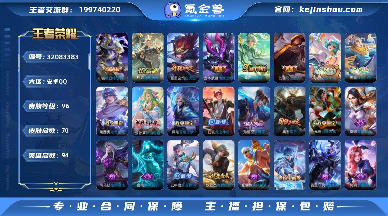 【性价比·银白咏叹调·白虎志·时之恋人·至尊宝·岱宗·可二次】YXw17969-安卓Q-94英雄-70皮肤-4王者印记-84铭文-贵族积分1w【贵族6】【1典藏·5传说·1按键】【因赛季更新游戏段付以上号为准!】 【英雄全皮】:敖隐全皮 【荣耀典藏】:铠银白咏叹调 【传说皮肤】:后羿神树通天,桑启鸣野蒿,刘备时之恋人,百里玄策白虎志,宫本武藏地狱之眼 【限定皮肤】:虞姬夏日便利店,狄仁杰阴阳师,赵云皇家上将,元歌云间偶戏,典韦岱宗,狄仁杰魔术师,项羽海滩派对,孙悟空至尊宝,百里玄策白虎志,云中君纤云弄巧,鲁班大师探海日志,张良古海寻踪,蒙犽百解令,鬼谷子天穹祈灯 【年限皮肤】:百里玄策白虎志,典韦岱宗 【赛季限定】:鲁班大师探海日志,张良古海寻踪,鬼谷子天穹祈灯,甄姬逆浪荇歌,亚瑟荣光之誓 【战令限定】:元歌云间偶戏,虞姬夏日便利店,孙悟空神迹守卫,周瑜百相守梦,孙策百相守梦,莱西奥光弋星穹,明世隐往忆晖光,周瑜线条小狗,小乔线条小狗 【史诗皮肤】:周瑜线条小狗,小乔线条小狗,莱西奥光弋星穹,公孙离涂山容容,周瑜百相守梦,狂铁龙之律动,弈星万物之道,蒙犽百解令,司马懿暗渊魔法,元歌云间偶戏,云中君纤云弄巧,典韦岱宗,狄仁杰鹰眼统帅,阿轲节奏热浪,百里守约特工魅影,雅典娜冰冠公主,夏侯惇乘风破浪,孙悟空至尊宝,曹操幽灵船长,孙尚香水果甜心,宫本武藏鬼剑武藏,狄仁杰魔术师,赵云皇家上将,露娜紫霞仙子 【其他皮肤】:鲁班七号班班快跑,虞姬溯影追猎,艾琳鹤鸣心笺,明世隐往忆晖光,亚瑟荣光之誓,哪吒罗小黑战记,鬼谷子克喵,孙策百相守梦,甄姬逆浪荇歌,戈娅玫蓝誓约,西施雪境奇遇,苍苍林狼骑,孙悟空神迹守卫,虞姬夏日便利店,大司命暗都幽影,鬼谷子天穹祈灯,后羿完美运算,张良古海寻踪,鲁班大师探海日志,刘禅唤灵魔甲,狂铁命运角斗场,刘备...