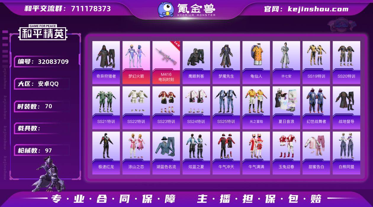 【kyhp904】安卓 手Q-2粉装-5特效枪-0载具-0粉色飞行器-26637热力值-3王牌印记-70套装-97枪皮 【热门品类】:粉装-梦幻火箭,套装-奇异狩猎者,套装-龟仙人 【粉色套装】:粉装-梦幻火箭,角色-罪夜之冕 【粉色枪皮等级】:M416-电玩时刻(五级),ACE32-萌骑漫游(四级),UMP45-萌骑冒险(三级),AKS-74U-森灵之息(五级),Mk14-福马献瑞(五级) 【粉色枪皮】:M416-电玩时刻,ACE32-萌骑漫游,UMP45-萌骑冒险,AKS-74U-森灵之息,Mk14-福马献瑞 【粉色降落伞】:梦幻火箭降落伞,音爆索尼克降落伞,未来歌姬降落伞,圣堂之誓降落伞 【稀有套装】:套装-龟仙人,角色-幸运青,角色-阿虎,套装-马上有钱,套装-大漠长歌,套装-暮夜私语,角色-许七安,套装-雨过天青,套装-红釉青花 【稀有枪皮】:AKM-影袭,AKM-破晓战魂,AKM-龙的传人,M16A4-幻世战舞者,SCAR-L-玉兔迎春,SCAR-L-红色方程式,M416-糯团青竹,M416-红色方程式,M416-绯红前夜,M416-蓝色火焰,GROZA-彩虹符号,GROZA-影袭,GROZA-懵萌河马,AUG-天降萌叽,AUG-耀粉歌者,QBZ-彩虹符号,QBZ-飞驰魅影,M762-绯红前夜,G36C-懵萌河马,蜜獾-娇憨猪猪,UZI-娇憨猪猪,UZI-影袭,UMP45-涂山之恋,UMP45-生命誓言,UMP45-蓝色火焰,Vector-生命誓言,汤姆逊-天降萌叽,汤姆逊-奇异狩猎者,P90-飞驰魅影,Kar98K-影袭,Kar98K-梦幻火箭,Kar98K-炫彩节奏,Kar98K-飞驰魅影,Kar98K-黑白懵懵牛,M24-影袭,M24-炫彩节奏,SKS-夜灯,SKS-炫彩节奏,SKS-青丘仙客,VSS-彩虹符号,Mini14-梦幻火箭,Mini14-耀粉歌者,SLR-娇憨猪猪,莫辛纳甘-懵萌河马,M417-惊鸿侠骨,M200-惊鸿侠骨,S686-奇异狩猎者,S686-生命誓言,S1897-炫彩节奏,S1897-飞驰魅影,S12K-玩趣呆呆,S12K-娇憨猪猪,S12K-幻世战舞者,S12K-幻影战神,DBS-黑白懵懵牛,DP-28-甜蜜旋律,MG3-幻...