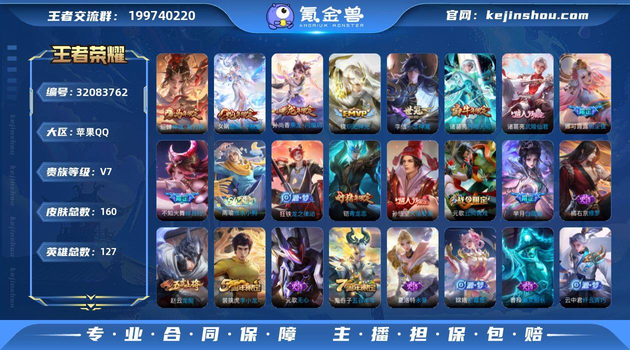 苹果Q 可二次 9传说127英雄160皮肤 乘龙问璇玑 神骥聚万邦 愿照千秋盛 时雨天司 武陵仙君 前尘镜 绯月行 炽阳神光 一念神魔 青龙志 时雨天司 龙胆 大圣娶亲 白晶晶 拒霜思 猎兽之王 云间偶戏 龙鼓争鸣 原初探秘者 李小龙 蔷薇恋人 黄金分割率 逐浪之夏 修罗 幽灵船长 永昼 街头霸王 鬼剑武藏 蜃楼王 妖精王 炼金王 凯尔特女王 狰 饕餮 烛龙 重明 穷奇 御狮 御霄 御旌 疑决卦 醍醐杖 万华元夜 演武夺筹 驱傩正仪 千军破阵 沙漠行僧 金庭之子 大漠名商 云中旅人 丁香结 海盐诗旅 科学大爆炸 皇家上将 探海日志 水果甜心 古海寻踪 无心 纤云弄巧 五谷丰年 遇见飞天 鹰眼统帅 魔术师 王者荣耀账号