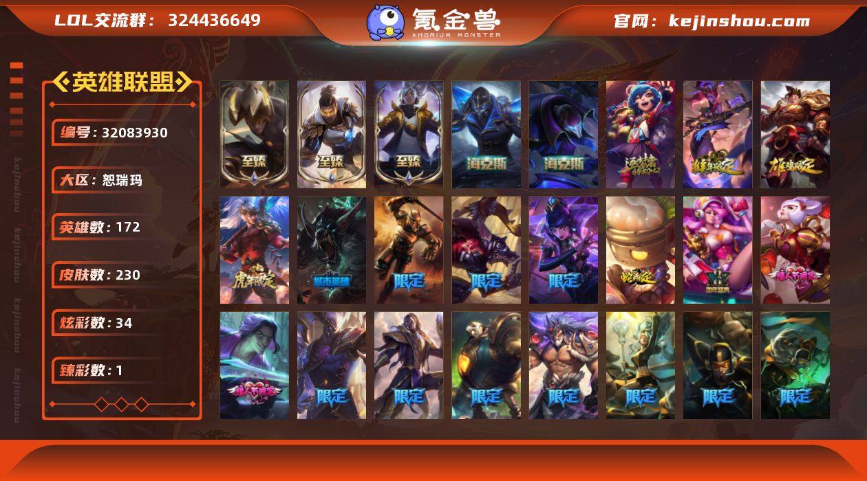单双钻石段位-172英雄-230皮肤-34炫彩-0终极-7神话-36限定-21传说-56史诗 【神话皮肤】:十周年纪念安妮,神凰行者瑞羽圣凰艾尼维亚,海克斯科技卡萨丁,海克斯科技魔腾,至臻真实伤害亚索,至臻黑夜使者李青,至臻未来战士卢锡安 【至臻皮肤】:至臻黑夜使者李青,至臻真实伤害亚索,至臻未来战士卢锡安 【臻彩皮肤】:无畏骑士瑟庄妮赤子初心 【年限皮肤】:玉净夜叉凯特琳,张辽文远,猛虎下山赵信,点心宝贝阿木木 【海克斯皮肤】:海克斯科技卡萨丁,海克斯科技魔腾 【情人节限定】:觅心魔灵奥莉安娜,幽梦玫瑰泰隆 【冰雪限定】:幸福女神乐芙兰,圣诞狂欢基兰,雪默丁格,魄罗骑士瑟庄妮,北极星神黛安娜 【限定皮肤】:冠军蔷薇乐芙兰,Fnatic迦娜,Fnatic嘉文四世,Fnatic卡尔萨斯,Fnatic库奇,暗杀星慎,SKTT1贾克斯,SSW辛吉德,SKTT1雷克顿,SKTT1伊莉丝,SKTT1扎克,FPX薇恩,电玩女神厄运小姐,胜利之剑亚托克斯,胜利枪神卢锡安,胜利机器人布里茨,胜利之王泰达米尔,南瓜头费德提克,鬼影重重魔腾,泳池派对厄运小姐,泳池派对格雷福斯,暗影沃里克,都铎王朝图奇,警用试作体K9内瑟斯 【传说皮肤】:源计划林易,提莫约德尔人的一大步,欧米伽小队幽灵特工,烈焰雄心崔丝塔娜,绅士科加斯,红色男爵库奇,冰川巨兽墨菲特,上古战魂魔腾,地狱行者孙悟空,神龙尊者圣龙李青,源计划净化薇恩,第三类接触黑默丁格,炼狱魔犬内瑟斯,黎明使者锐雯,黯黑魔龙希瓦娜,焰尾妖狐阿狸,星之守护者阿狸,泳池派对吉格斯,霸天异形卡兹克,神王德莱厄斯,天煞劫 【史诗皮肤】:安伯斯与提妮,皇家火枪手崔斯特,屠龙勇士赵信,摄魂男爵弗拉基米尔,战场公主希维尔,熊猫提莫,狼外婆沃里克,紫晶射手艾希,刀锋女王莫甘娜,死神卡尔萨斯,卡尔萨斯祸害之光,全金属狂潮拉莫斯,掠星魔刃卡萨丁,夜行义贼...