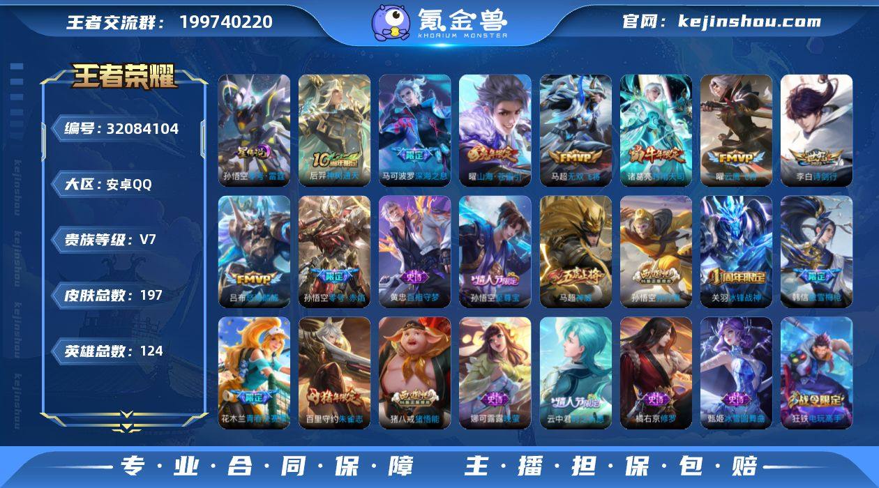 可换绑【捡漏精品号·白虎志·诗剑行·一念神魔·无双飞将·傲雪梅枪·朱雀志·1星元·多传说限定号】幸运值252 2按键,1星传说,17王者印记,五级铭文190,可二次CD17637,安卓Q-V7-161皮肤-12传说-47史诗【英雄全皮】:孙权全皮【星元皮肤】:狄仁杰星际治安官【传说皮肤】:后羿神树通天,桑启鸣野蒿,宫本武藏惊梅引,李白诗剑行,狄仁杰神器狴犴令,马超无双飞将,李信一念神魔,达摩黄金狮子座,百里玄策白虎志,后羿黄金射手座,宫本武藏地狱之眼,狄仁杰超时空战士【限定皮肤】:姜子牙天穹之誓,狄仁杰阴阳师,赵云皇家上将,墨子神迹守卫,高渐离玩趣恶龙,马可波罗山海玄木吟,狄仁杰魔术师,狄仁杰万华元夜,狄仁杰神器狴犴令,达摩沙漠行僧,项羽海滩派对,老夫子醍醐杖,老夫子航海奇遇记,程咬金演武夺筹,韩信傲雪梅枪,王昭君午后时光,兰陵王金庭之子,李元芳云中旅人,钟馗驱傩正仪,雅典娜黎明之约,蔡文姬繁星吟游,鬼谷子原初探秘者,鬼谷子五谷丰年,苏烈千军破阵,百里玄策白虎志,百里玄策原初追逐者,百里守约朱雀志,梦奇顽趣,沈梦溪大漠名商,沈梦溪匿光破解者,明世隐疑决卦,裴擒虎李小龙,裴擒虎擒涛扼浪,狂铁电玩高手,云中君时之祈愿,上官婉儿梁祝,嫦娥拒霜思,鲁班大师探海日志,桑启海盐诗旅,艾琳女武神,艾琳流音漫舞,司空震地狱燃心,张良古海寻踪,蒙犽百解令,蒙恬荣光圣徽,鬼谷子天穹祈灯,刘邦剑破天穹,周瑜熔金海岸【年限皮肤】:百里玄策白虎志,百里守约朱雀志,马可波罗山海玄木吟【赛季限定】:明世隐疑决卦,老夫子醍醐杖,鬼谷子原初探秘者,狄仁杰万华元夜,程咬金演武夺筹,钟馗驱傩正仪,苏烈千军破阵,达摩沙漠行僧,兰陵王金庭之子,沈梦溪大漠名商,李元芳云中旅人,桑启海盐诗旅,裴擒虎擒涛扼浪,鲁班大师探海日志,张良古海寻踪,鬼谷子天穹祈灯,刘邦...