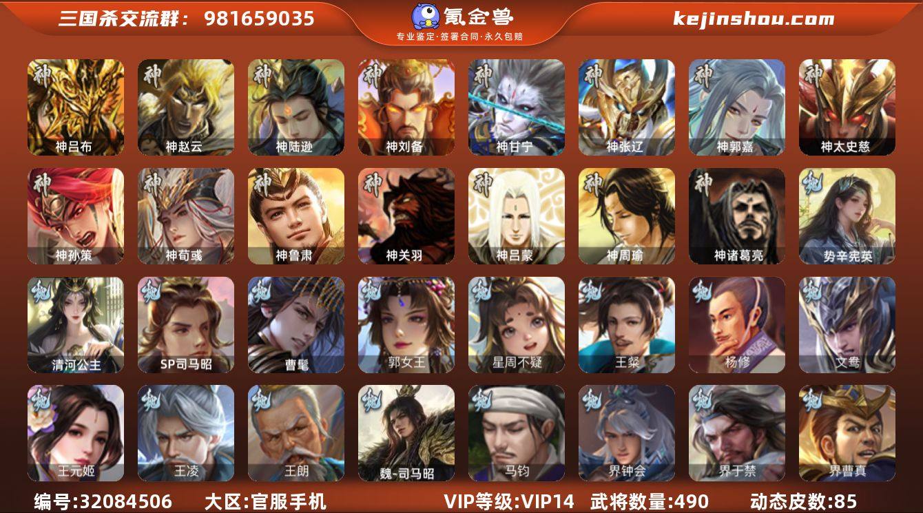 官阶: 大将军 VIP等级: VIP14 武将数量: 490 动态皮肤数量: 85 神将: 神甘宁,神郭嘉,神刘备,神陆逊,神吕布,神孙策,神太史慈,神荀彧,神张辽,神赵云,神关羽,神吕蒙,神周瑜,神诸葛亮,神鲁肃 魏国武将: 刘晔,戏志才,曹纯,曹婴,陈琳,程昱,郝昭,嵇康,界曹真,界于禁,界钟会,马钧,魏-司马昭,王朗,王凌,王元姬,文鸯,杨修,王粲,唐咨-魏,张辽,SP蔡文姬,SP曹仁,SP关羽,SP贾诩,SP姜维,SP庞德,卞夫人,蔡贞姬,曹昂,曹操,曹冲,曹洪,曹丕,曹仁,曹叡,曹嵩,贾逵,王异,张恭,鲁芝,界满宠,曹休,界曹植,满宠,荀攸,王基,钟繇,蒯越蒯良,郭嘉,牵招,荀彧,阮慧,杜畿,界郭嘉,崔琰,界曹丕,界荀彧,朱灵,界甄姬,吕虔,界王异,界许褚,界郭淮,华歆,陈群,界邓艾,界典韦,界曹休,司马孚,袁涣,李通,乐进,辛宪英,郭淮,毛玠,界曹彰,郭皇后,毌丘俭,夏侯惇,曹植,司马朗,谋于禁,界曹操,星周不疑,许褚,界张辽,谋徐晃,张郃,钟会,文聘,郭女王,曹彰,界夏侯惇,诸葛诞,司马懿,甄姬,界徐晃,徐晃,界曹仁,孙资刘放,韩浩史涣,胡班,曹真,典韦,界夏侯渊,谋荀彧,夏侯渊,李典,于禁,王双,邓艾,界司马懿,张春华,孟达-魏,臧霸,牛金,朱灵(国战),文钦-魏,曹髦,成济,玄·毌丘俭,李昭焦伯,清河公主,SP司马昭,司马伷,董昭,谋郭嘉,谋夏侯渊,势辛宪英 蜀国武将: 董允,关索,花鬘,界黄忠,谯周,沙摩柯,王平,张星彩,赵襄,诸葛瞻,谋马超,谋赵云,谋夏侯氏,马云騄,谋黄月英,徐庶,界魏延,杨仪,吕凯,界关羽,界诸葛亮,邓芝,界伊籍,胡金定,费祎,严颜,界黄月英,界张嶷,赵云,张松,李丰,界刘备,界刘禅,刘封,糜竺,李遗,蒋琬,谋庞统,黄月英,刘巴,关羽,王甫赵累,吴懿,吴班,界吴懿,界廖化,祝融,张飞,黄皓,陈震,魏延,界周仓,谋祝融,马忠,界法正,糜夫人,界孟获,刘禅,界赵云,谋诸葛亮,界姜维,张翼,关银屏,界祝融,SP孙尚香,SP徐庶,卧龙诸葛,宗预,周仓,简雍,谋孟获,界关兴张苞,诸葛亮,孙乾,界张飞,界卧龙诸葛,法...