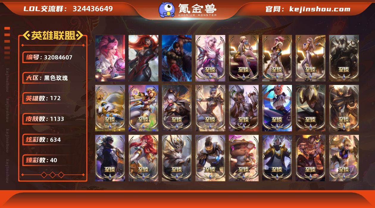 未定级段位-172英雄-1133皮肤-634炫彩-5终极-99神话-199限定-102传说-214史诗 【神话皮肤】:十周年纪念安妮,源代码乐芙兰,十五周年纪念希维尔,水晶圣骑艾希,新卧虎藏龙贾克斯,暗星科加斯,神凰行者瑞羽圣凰艾尼维亚,黎明使者卡尔玛,灰烬征服者潘森,灰烬骑士莫德凯撒,水晶圣骑蕾欧娜,灰烬守护者慎,水晶掠夺者卡兹克,星之守护者塔莉垭,灰烬杀手塞拉斯,海克斯科技安妮,海克斯科技波比,海克斯科技崔丝塔娜,海克斯科技嘉文四世,海克斯科技吉格斯,海克斯科技卡萨丁,海克斯科技克格莫,海克斯科技雷克顿,海克斯科技瑟庄妮,海克斯科技斯维因,恐惧新星德莱厄斯,摄魂使者薇恩,新创战纪希维尔,至臻真实伤害奇亚娜,至臻真实伤害奇亚娜2022,至臻真实伤害赛娜,至臻真实伤害亚索,至臻至高天奎桑提,至臻天龙之子伊泽瑞尔,至臻西部魔影伊芙琳,至臻电玩女神凯特琳,至臻电玩女神凯特琳2022,至臻DRX亚托克斯,至臻飞升战神潘森,至臻福牛守护者菲奥娜,至臻海珀利安小队X09星环灵风迦娜,至臻海之歌萨勒芬妮,至臻黑夜使者凯隐,至臻黑夜使者李青,至臻黑夜使者李青2022,至臻幻灵战斗猫金克丝,至臻花仙使者卡特琳娜,至臻魂蔷薇烈娜塔,至臻剪纸仙灵希维尔,至臻KDA阿卡丽,至臻KDAALLOUT卡莎,至臻KDA卡莎,至臻KDA伊芙琳,至臻烈焰美人薇恩,至臻烈焰美人薇恩2022,至臻灵魂莲华提莫,至臻灵魂莲华易,至臻灵能特工伊泽瑞尔,至臻魅惑女巫厄运小姐,至臻魅惑女巫厄运小姐2022,至臻魅惑女巫莫甘娜,至臻魔女阿卡丽,至臻魔女婕拉,至臻魔女乐芙兰,至臻墨之影武者亚索,至臻女帝黛安娜,至臻青花瓷拉克丝,至臻青花瓷丽桑卓,至臻绒毛菲兹,至臻神凰行者烈羽焰凰霞,至臻神龙尊者均衡之龙沃利贝尔,至臻神龙尊者炎龙瑟提,至臻太空律动节奏幻师璐璐,至臻太空律动魔音海妖娜美,至臻王国机神...