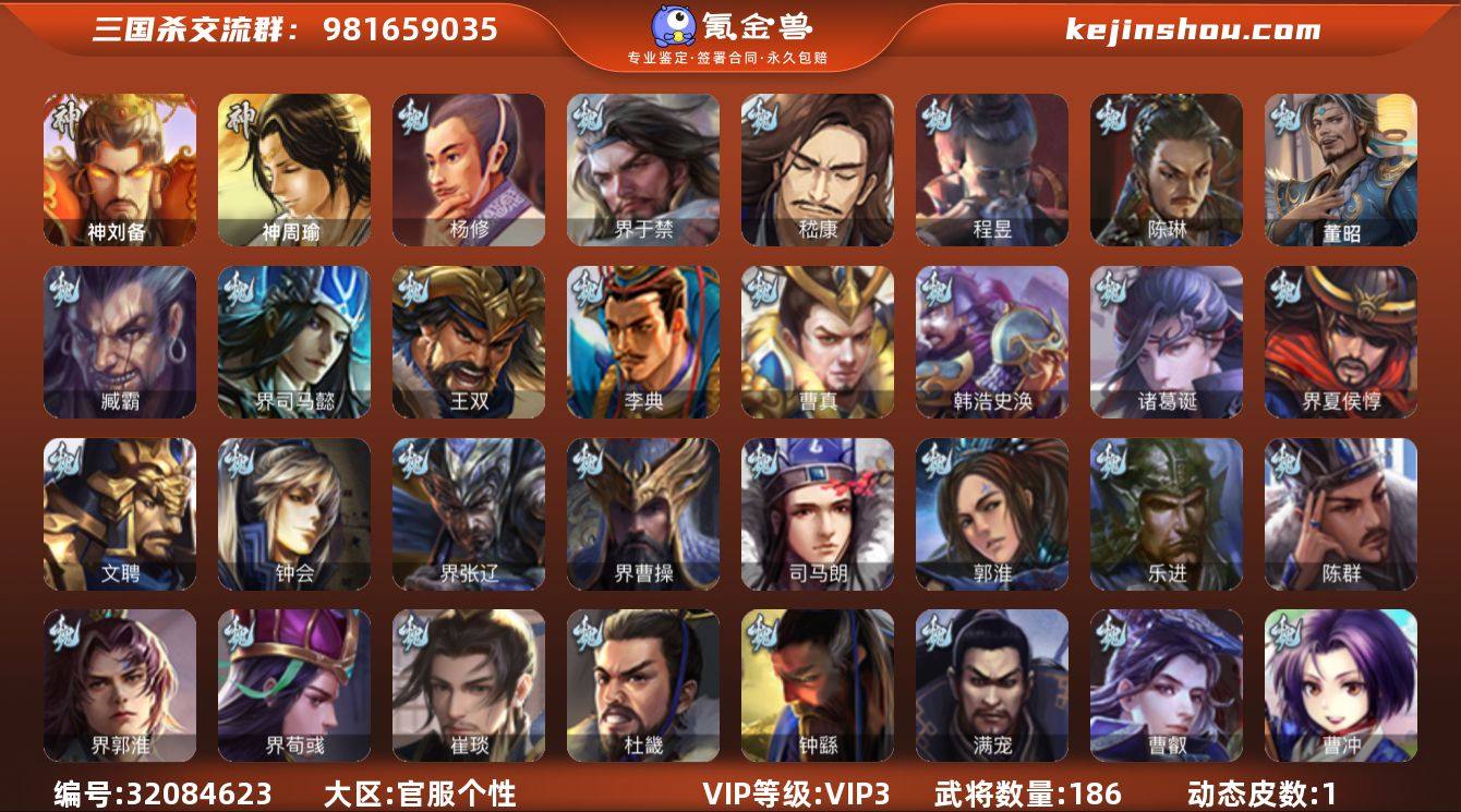 VIP等级:VIP3 官阶:中军将军 史诗武将数量:9 动态皮肤数量:1 宝珠数量:0 元宝数量:274 将魂数量:347 雁翎数量:11766 心愿积分数量:2952 欢乐豆数量:69064 金票数量:36 卖家说:9史诗双神双天工中军,6.9万豆,玉龙回廊动大宝,神刘备,谯周,界于禁,陈琳,嵇康,杨修,左慈,程昱9史诗,双天工谋大乔,文钦,秒杀将界廖化,带皮费祎,向宠,界孙权,谋韩当,崔琰,界吕布,友庞统,界关羽,界马超,王双,界曹植,界孙休,诸葛恪,界朱治,濮阳兴,势田丰186将,国战64将,满级活树