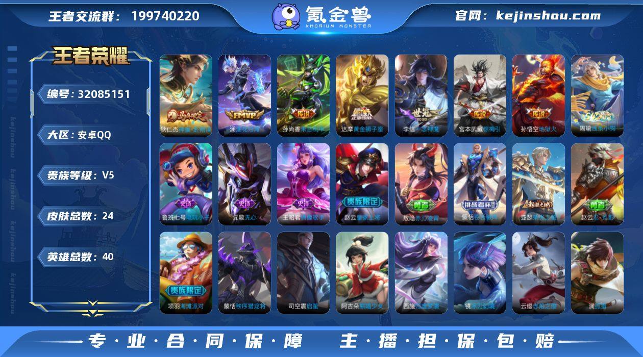贵族等级: V5 英雄数: 40 皮肤数: 24 传说皮: 黄金狮子座,一念神魔,末日机甲-孙尚香,地狱火,惊梅引,澜逐花归海,神骥·赴朔漠