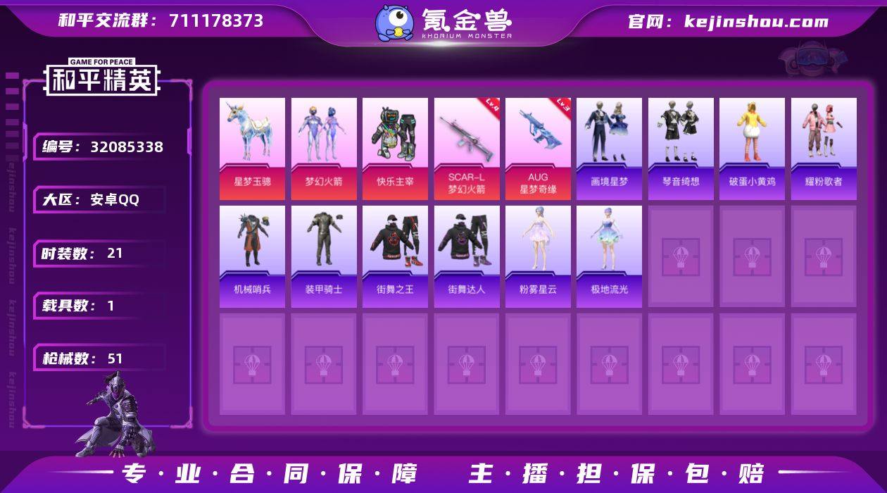 安卓 【男神号 梦幻火箭/SCAR-L-梦幻火箭(四级)/AUG-星梦奇缘(三级)/星梦玉骢】手Q-2粉装-5特效枪-1载具-2粉色飞行器-15274热力值-1王牌印记-21套装-51枪皮 【热门品类】:粉装-梦幻火箭 【粉色套装】:粉装-快乐主宰,粉装-梦幻火箭 【粉色枪皮等级】:SCAR-L-梦幻火箭(四级),AUG-星梦奇缘(三级),AKS-74U-森灵之息(四级),Mk14-福马献瑞(五级),PKM-萌骑夺宝(三级) 【粉色载具】:星梦玉骢 【粉色枪皮】:SCAR-L-梦幻火箭,AUG-星梦奇缘,AKS-74U-森灵之息,Mk14-福马献瑞,PKM-萌骑夺宝 【粉色飞行器】:香车宝马飞行器,梦幻火箭飞行器 【粉色降落伞】:快乐主宰降落伞,梦幻火箭降落伞,星梦奇缘降落伞,霁蓝缠春降落伞 【稀有套装】:套装-马上来财,套装-画境星梦,套装-琴音绮想,套装-雨过天青,套装-红釉青花,角色-绯影武装 【稀有枪皮】:M16A4-快乐主宰,M416-仓鼠灰灰,M416-快乐主宰,M762-快乐主宰,ACE32-画境星梦,UZI-炫彩节奏,UMP45-快乐主宰,MP5K-画境星梦,P90-绯影武装,Kar98K-梦幻火箭,AWM-黄金龙骨,SKS-炫彩节奏,Mini14-梦幻火箭,Mini14-耀粉歌者,SVD-绯影武装,M1加兰德-画境星梦,AA12-G-画境星梦,MG3-幻世战舞者,F57-绯影武装,平底锅-画境星梦 【其他套装】:套装-破蛋小黄鸡,套装-耀粉歌者,套装-机械哨兵,套装-装甲骑士,套装-街舞之王,套装-街舞达人,角色-粉雾星云,角色-极地流光 【稀有头盔】:梦幻火箭头盔(3级),梦幻火箭头盔(2级),梦幻火箭头盔(1级),金羽特工头盔(3级),金羽特工头盔(2级),金羽特工头盔(1级) 【稀有背包】:梦幻火箭背包(3级),梦幻火箭背包(2级),梦幻火箭背包(1级) 【营地ID】:1048779092