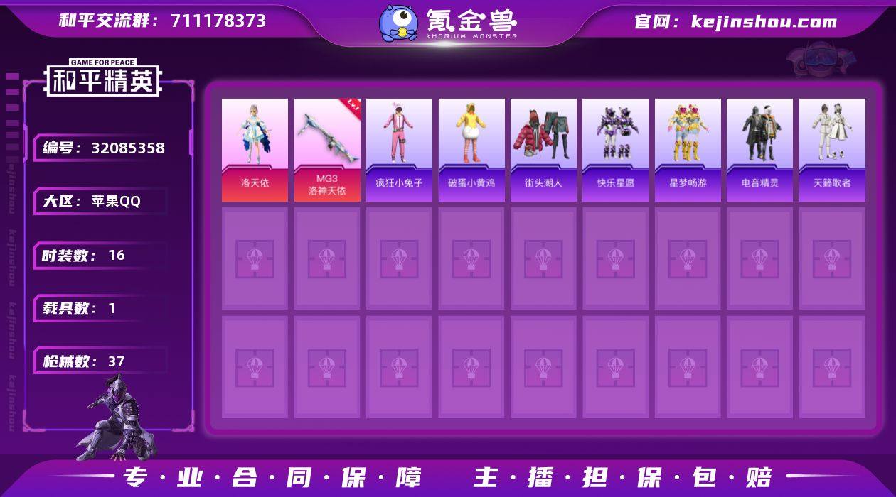 苹果 【小号 洛天依/SCAR-L-灵驹仙姬(三级)/ACE32-萌骑漫游(五级)/九霄玄鹿】手Q-1粉装-4特效枪-1载具-2粉色飞行器-11417热力值-2王牌印记-16套装-37枪皮 【粉色套装】:角色-洛天依 【粉色枪皮等级】:SCAR-L-灵驹仙姬(三级),ACE32-萌骑漫游(五级),Mk14-福马献瑞(一级),MG3-洛神天依(一级) 【粉色载具】:九霄玄鹿 【粉色枪皮】:SCAR-L-灵驹仙姬,ACE32-萌骑漫游,Mk14-福马献瑞,MG3-洛神天依 【粉色飞行器】:香车宝马飞行器,云梦轻舟飞行器 【粉色降落伞】:星之彼岸降落伞,洛神天依降落伞,灵驹仙姬降落伞 【稀有套装】:套装-马上来财,套装-雨过天青,套装-红釉青花 【稀有枪皮】:AKM-星之彼岸,AKM-龙的传人,SCAR-L-玉兔迎春,SCAR-L-黄金龙骨,QBZ-洛神天依,Mk47-洛神天依,G36C-灵驹仙姬,Kar98K-洛神天依,AWM-暮色玫影,VSS-星之彼岸,Mini14-耀粉歌者,SVD-灵驹仙姬,M249-星之彼岸,F57-灵驹仙姬,爆炸猎弓-喜羊羊与灰太狼 【其他套装】:套装-疯狂小兔子,套装-破蛋小黄鸡,套装-街头潮人,套装-快乐星愿,套装-星梦畅游,套装-电音精灵,套装-天籁歌者 【稀有头盔】:金羽特工头盔(1级) 【营地ID】:1036953153