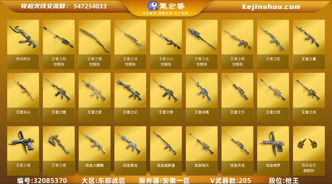 安徽一区-220V-25王者武器数-9炫金武器数 【传说武器】:传说辉光 【热门武器】:传说辉光,QBZ03-金色蔷薇*2,HK417-朱雀,M200-幻神*2,死亡之眼*2,白虎-电玩蓝兔,柯尔特-冠军之特,王者炎心,金色小号,C.A.T,M4A1-黑骑士*2,汤姆逊-烈龙*8,RPK-盘龙*7,加特林-炼狱*2,火麒麟-绝迹,COP-堕天神*3,沙鹰-修罗*5,高爆手雷-幻兽 【王者炫金武器】:王者冰魄,王者炎心,王者之幻*2,王者之翼*2,王者之势,王者之武,王者之影,王者之魄,王者之光,王者之怒,王者之力,王者之魂*2,王者之啸,炫金火麒麟,炫金黑龙,炫金超新星,炫金毁灭*4,炫金天龙,炫金修罗 【音效卡】:M200-幻神音效卡,AK47-火麒麟音效卡*2,M4A1-雷神音效卡*2,M4A1-黑龙音效卡,M4A1-黑骑士音效卡,Barrett-毁灭音效卡 【皮肤】:幻神-巅峰荣耀,雷神-暗月,雷神-能量核心*3,雷神-荣耀之魄*2,雷神-星空,雷神-虎将,雷神-耀金皮肤,M4A1-再燃火线,火麒麟-冠军之心,火麒麟-华夏之心,AK47-火麒麟-传奇EVEN,火麒麟-轻羽皮肤,火麒麟-平天大圣,毁灭-暗月*2,毁灭耀金皮肤*3,毁灭-星空,毁灭-冠军之怒,毁灭-AG-CFPLS15冠军,毁灭-CFS2020,毁灭-英雄计划 皮肤,M4A1-千变-孔明皮肤,黑龙-能量核心*2,黑龙-暗月,M4A1-黑龙-361,黑骑士-暗月,黑骑士耀金皮肤,黑骑士-冠军之势,无影-暗月*6,无影-能量核心,无影耀金皮肤*2,死神-秘银,AK47-黑武士-361,天启-暗月*4,战神-粉色甜心皮肤,战神-紫绶金章皮肤,战神-流金岁月皮肤*2,AK47-B-常胜将军-曹操,天龙-秘银*2,天龙-能量核心*2,AWM-天龙-传奇70KG,AWM-天龙-传奇白鲨,极光-能量核心*3,极光-高能霹雳 皮肤,修罗-能量核心*5,天神-暗月*9,屠龙-荣耀之锋,龙啸-冠军之啸,轻型军用手斧-再燃火线 【角色】:零,葵,樱,瞳,魅影,炫,迷迭香,审判者,王者-葵-貂...