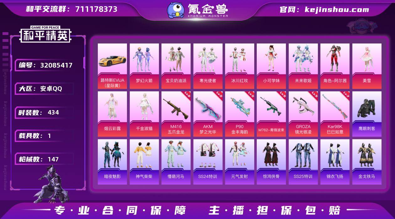 实名: 可修改 时装数: 434 载具数: 1 枪械数: 147 战备数: 106 热门装扮: 梦幻火箭(新101),宝贝奶油派,鹰眼刺客,寒光使者,冰川红玫,小可学妹,未来歌姬,阿尔茜,暗夜魅影,烟云彩露,美雪,千金淑猫 载具: 路特斯EVIJA(星际黄) 稀有枪皮: M416五爪金龙,AKM梦之光华,P90-金丰海韵,M762-青锋波束,GROZA-镜光银凌,Kar98K-巳巳如意