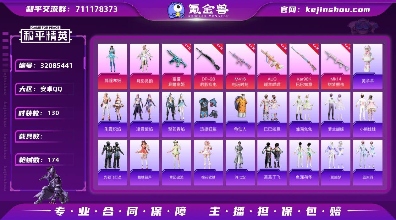 J2156 精品 3粉 6特 安卓 手Q-3粉装-6特效枪-0载具-1粉色飞行器-46198热力值-10王牌印记-130套装-174枪皮 【热门品类】:套装-龟仙人 【粉色套装】:角色-月影灵韵,角色-异瞳寒姬,角色-霁蓝缠春 【粉色枪皮等级】:M416-电玩时刻(五级),AUG-暖羊咩咩(五级),蜜獾-异瞳寒姬(六级),Kar98K-巳巳如意(五级),Mk14-甜梦熊击(五级),DP-28-豹影疾电(五级) 【粉色枪皮】:M416-电玩时刻,AUG-暖羊咩咩,蜜獾-异瞳寒姬,Kar98K-巳巳如意,Mk14-甜梦熊击,DP-28-豹影疾电 【粉色飞行器】:炫彩糖果飞行器 【粉色降落伞】:环太平洋降落伞,圣堂之誓降落伞,精灵梦叶罗丽降落伞,临安公主降落伞,绯穹魔姬降落伞,喜羊羊与灰太狼降落伞,炫彩糖果降落伞 【稀有套装】:套装-龟仙人,套装-巳巳如意,套装-雪国风尚,套装-炫彩糖果,套装-雏菊兔兔,套装-萝兰蝴蝶,套装-小熊娃娃,套装-先驱飞行员,套装-糖糖葫芦,套装-青团波波,套装-棉花软糖,角色-许七安,套装-燕燕于飞,套装-鱼渊荷华,套装-紫幽梦,套装-蓝冰羽,套装-星影赞美诗,套装-云朵鹅,套装-雪绒豹,角色-时希公主,角色-夜瞳黯灵,套装-朱霞炽焰,套装-凌霄紫焰,套装-擎苍青焰,玩偶服-美羊羊 【稀有枪皮】:AUG-冰晶雪宝,AKM-破晓战魂,AKM-霓虹街区,AKM-龙的传人,M16A4-幻世战舞者,M16A4-红色方程式,M16A4-蓝色火焰,SCAR-L-夜灯,SCAR-L-红色方程式,SCAR-L-黄金龙骨,M416-糯团青竹,M416-红色方程式,M416-蓝色火焰,GROZA-恐龙拽拽,GROZA-雷霆特警,AUG-天降萌叽,AUG-耀粉歌者,M762-云朵鹅,M762-登顶巅峰,G36C-星穹咏叹调,AC-VAL-快闪甜心,蜜獾-天降萌叽,蜜獾-绯穹魔姬,ARX-凌霄紫焰,UZI-啾咪啾咪,UZI-天降萌叽,UZI-红色方程式,UMP45-夜灯,UMP45-生命誓言,UMP45-蓝色火焰,UMP45-极意拳锋,Vector-焰鹰斗篷,汤姆逊-环太平...