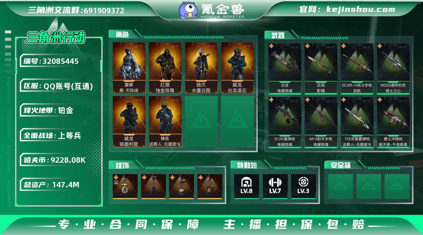 实名:不可二次实名 总资产:147.4M 哈夫币:9228.08K 烽火地带段位:铂金 烽火地带等级:60 全面战场段位:上等兵 全面战场等级:45 8级仓库,7级训练中心,3级靶场,3级指挥中心,0级潜水中心,3级防具台,3级工作台,3级制药台,3级技术中心,0级收藏室 战术部门等级:3 战斗部门等级:2 医疗部门等级:3 研发部门等级:2 后勤部门等级:1 曼德尔砖-气象感应:0 曼德尔砖-命运王牌:0 曼德尔砖-电玩高手:0 曼德尔砖-美杜莎:0