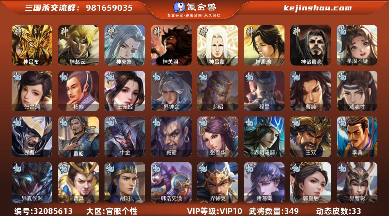官阶:大将军;VIP等级:VIP10;史诗武将数量:29;动态皮肤数量:33;武将总数:349;史诗宝珠数量:0;将魂数量:8648;神将:5;魏国史诗武将:21;蜀国史诗武将:7;吴国史诗武将:3;群史诗武将:10 神吕布,神赵云,神郭嘉,神诸葛亮,星周不疑,张昌蒲,杨修,王元姬,界钟会,郝昭,曹纯,戏志才,程昱,关索,谋赵云,谋马超,沙摩柯,花鬘,董允,孙寒华,界徐盛,谋貂蝉,界沮授,左慈,麹义,南华老仙,刘焉,许攸,兀突骨,士燮,神吕蒙,神周瑜,神关羽,SP关羽,SP蔡文姬,乐进,曹昂,诸葛诞,朱灵,文聘,SP姜维,张春华,钟会,曹冲,郭淮,满宠,界王异,界曹操,界司马懿,界夏侯惇,界张辽,界许褚,界郭嘉,李典,曹真,韩浩史涣,陈群,曹叡,曹休,钟繇,司马朗,王基,李通,郭皇后,辛宪英,吕虔,鲁芝,蒯越蒯良,界典韦,界荀彧,界徐晃,杜畿,界曹丕,界邓艾,张恭,界曹植,界曹彰,界满宠,界郭淮,卞夫人,华歆,袁涣,王双,崔琰,阮慧,曹嵩,谋徐晃,谋于禁,谋甄姬,胡班,牛金,界夏侯渊,界曹仁,臧霸,董昭,势陈到,SP孙尚香,关银屏,夏侯霸,马良,关兴张苞,廖化,界马岱,关平,简雍,刘封,界法正,界关兴张苞,界刘备,界关羽,界张飞,界赵云,界马超,SP徐庶,吴懿,周仓,张松,刘谌,夏侯氏,糜竺,马忠,李严,黄皓,界黄月英,界诸葛亮,赵统赵广,严颜,界伊籍,界卧龙诸葛,界庞统,界孟获,界祝融,陈到,界姜维,界刘禅,张翼,杨仪,邓芝,傅肜,陈震,费祎,糜夫人,王甫赵累,界周仓,彭羕,谋姜维,谋张飞,诸葛果,界魏延,蒋琬费祎,糜芳傅士仁,甘夫人,鲁肃,孙茹,凌操,大乔小乔,诸葛恪,诸葛瑾,孙鲁育,程普,韩当,潘璋马忠,虞翻,朱然,界周泰,界甘宁,界吕蒙,界黄盖,界周瑜,界大乔,界陆逊,孙鲁班,朱桓,顾雍,孙休,朱治,全琮,阚泽,孙登,岑昏,界孙权,界孙尚香,潘濬,孙亮,严畯,界孙坚,吕岱,周妃,陆抗,界孙策,许贡,卫温诸葛直,界吴国太,界凌统,界程普,界虞翻,蒋钦,吕范,界孙鲁班,濮阳兴,谋韩当,谋吕蒙,界朱桓,界小乔,友庞统,伏完,...