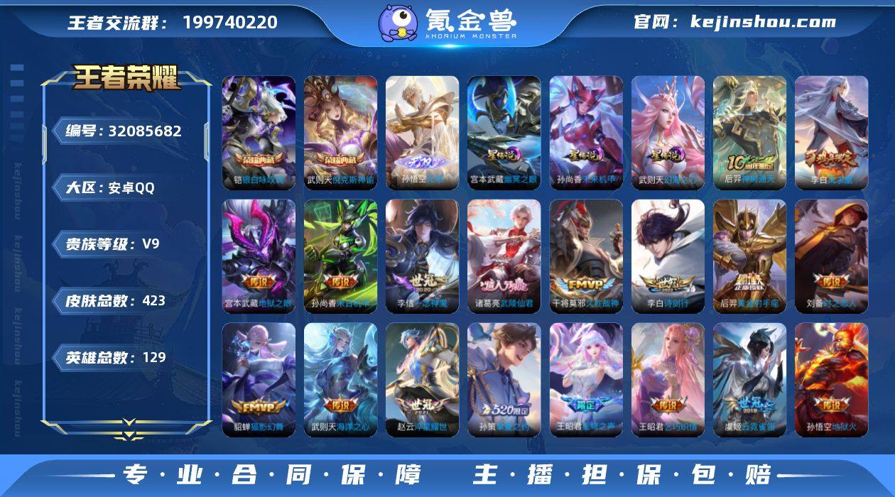 V9 3典藏 1无双 22传说 3星元 423皮肤 129英雄 【3水晶】武则天-倪克斯神谕,铠-银白咏叹调【1无双】孙悟空-无相【22传说】李白-诗剑行,孙尚香-音你闪耀,孙策-挚爱之约,貂蝉-猫影幻舞,干将莫邪-久胜战神,宫本武藏-地狱之眼,后羿-黄金射手座,铠-绛天战甲,李白-凤求凰,李信-一念神魔,刘备-时之恋人,孙尚香-末日机甲,孙悟空-地狱火,王昭君-乞巧织情,武则天-海洋之心,虞姬-云霓雀翎,虞姬-启明星使,赵云-淬星耀世,诸葛亮-武陵仙君,东皇太一-灼幽烈阳,王昭君-星穹之声,后羿-神树通天【3星元】孙尚香-未来机甲,武则天-幻海之心,宫本武藏-幽冥之眼【134史诗】元歌-无心,鬼谷子-五谷丰年,赵云-未来纪元,钟无艳-超时空战士,金蝉-唐三藏,狂铁-电玩高手,高渐离-天秀·音浪,貂蝉-唤灵魅影,艾琳-奇遇舞章,明世隐-吟游魔法,夏洛特-永昼,阿轲-暗夜猫娘,阿轲-节奏热浪,阿轲-迷踪丽影,安琪拉-魔法小厨娘,安琪拉-心灵骇客,安琪拉-时之奇旅,白起-星夜王子,百里守约-特工魅影,百里守约-朱雀志,百里玄策-原初追逐者,不知火舞-魅语,蔡文姬-舞动绿茵,曹操-幽灵船长,蔡文姬-繁星吟游,嫦娥-如梦令,嫦娥-拒霜思,程咬金-功夫厨神,妲己-女仆咖啡,妲己-魅力维加斯,妲己-热情桑巴,大乔-猫狗日记,大乔-白蛇,大乔-白鹤梁神女,狄仁杰-魔术师,狄仁杰-鹰眼统帅,典韦-蓝屏警告,貂蝉-圣诞恋歌,伽罗-箭羽风息,伽罗-天狼溯光者,干将莫邪-真爱魔法,公孙离-无限星赏官,宫本武藏-鬼剑武藏,韩信-白龙吟,韩信-傲雪梅枪,后羿-辉光之辰,花木兰-水晶猎龙者,黄忠-烈魂,橘右京-修罗,黄忠-火炮绅士,铠-曙光守护者,兰陵王-暗隐猎兽者,兰陵王-驯魔猎人,老夫子-航海奇遇记,李白-千年之狐,李元芳-逐浪之夏,李元芳-银河之约,廉颇-地狱岩魂,刘邦-德古拉伯爵,刘禅-绅士熊喵,刘禅-天才门将,露娜-紫霞仙子,鲁班七号-电玩小子,鲁班七号-狮舞东方,吕布-圣诞狂欢,吕布-末日机甲,吕布-...