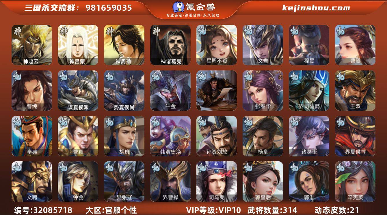 官阶:骠骑将军;VIP等级:VIP10;史诗武将数量:33;动态皮肤数量:21;武将总数:314;史诗宝珠数量:0;将魂数量:1153;神将:3;魏国史诗武将:12;蜀国史诗武将:9;吴国史诗武将:10;群史诗武将:14 神赵云,神诸葛亮,星周不疑,曹婴,曹纯,程昱,谋赵云,诸葛瞻,张星彩,沙摩柯,谯周,傅佥,花鬘,董允,周处,孙皓,骆统,留赞,界朱然,界徐盛,势太史慈,文鸯,十常侍,裴秀,界沮授,郑玄,张让,麹义,庞德公,刘焉,沮授,许攸,兀突骨,司马昭,神吕蒙,神周瑜,势夏侯尚,SP关羽,SP蔡文姬,乐进,曹昂,诸葛诞,朱灵,文聘,SP姜维,张春华,钟会,曹冲,郭淮,满宠,界王异,界曹操,界司马懿,界夏侯惇,界张辽,界许褚,界郭嘉,李典,曹真,韩浩史涣,陈群,曹叡,曹休,钟繇,司马朗,郭皇后,孙资刘放,辛宪英,吕虔,鲁芝,界荀彧,杜畿,界曹植,界满宠,卞夫人,华歆,蔡贞姬,袁涣,王双,崔琰,杨阜,阮慧,谋徐晃,界曹休,胡班,谋夏侯渊,牛金,SP孙尚香,夏侯霸,马良,关兴张苞,廖化,界马岱,关平,简雍,刘封,界法正,界关兴张苞,界刘备,界关羽,界张飞,界赵云,SP徐庶,吴懿,周仓,张松,刘谌,夏侯氏,糜竺,马忠,李严,黄皓,界黄月英,赵统赵广,严颜,界伊籍,界庞统,张翼,杨仪,傅肜,界简雍,糜夫人,界周仓,刘巴,彭羕,谋庞统,界张嶷,谋张飞,吴班,诸葛果,界魏延,蒋琬费祎,甘夫人,鲁肃,孙茹,凌操,诸葛恪,诸葛瑾,孙鲁育,程普,韩当,潘璋马忠,虞翻,朱然,界周泰,界甘宁,界吕蒙,界黄盖,界周瑜,界大乔,界陆逊,孙鲁班,朱桓,顾雍,孙休,朱治,全琮,孙登,界孙权,界孙尚香,潘濬,严畯,吕岱,许贡,卫温诸葛直,界潘璋马忠,孙邵,桥公,陈武董袭,蒋钦,吕范,界顾雍,界孙鲁班,谋吕蒙,谋周瑜,谋小乔,界小乔,孟达,友庞统,伏完,刘协,界袁术,SP赵云,张宝,伏皇后,李儒,界于吉,界张角,华雄,袁术,界华佗,界吕布,公孙瓒,蔡夫人,公孙渊,郭图逢纪,张鲁,蹋顿,严白虎,SP黄月英,董白,曹节,蔡邕,SP太史慈,卢植,刘琦,李傕,界袁绍,张济,刘...