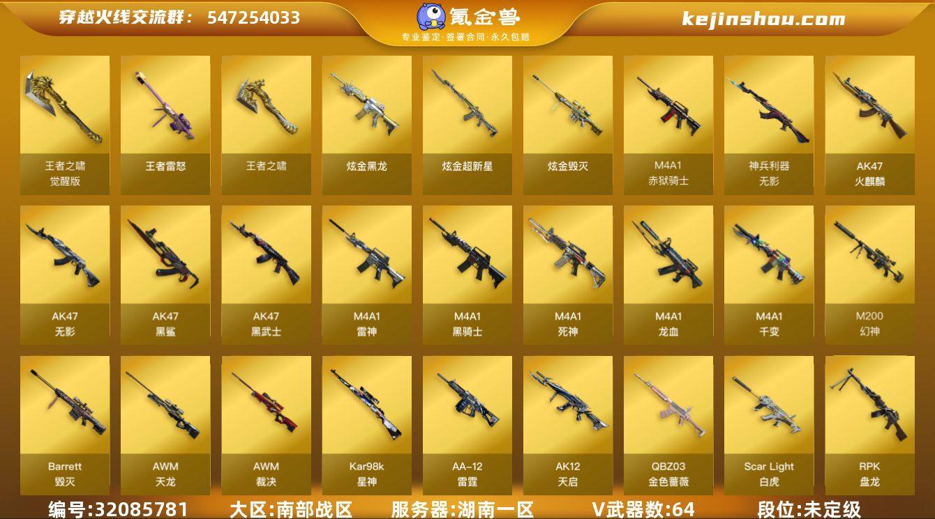 湖南一区-75V-18王者武器数-4炫金武器数 【热门武器】:QBZ03-金色蔷薇,Scar Light-白虎,M200-幻神,死亡之眼,Kar98K-星神,M4A1-黑骑士,汤姆逊-烈龙*6,RPK-盘龙*3,加特林-炼狱*4,斯泰尔-蝴蝶,沙鹰-修罗*8,金刚伞 【王者炫金武器】:王者雷怒,王者之啸,炫金黑龙,炫金超新星,炫金毁灭*2,王者之魄闪光弹 【音效卡】:AK47-火麒麟音效卡,M4A1-雷神音效卡,M4A1-黑骑士音效卡,AWM-裁决音效卡,Barrett-碧霄极光音效卡,死神-雪域霜狐-怀旧音效卡 【皮肤】:幻神-青鹤,幻神-AG-CFPL S24冠军 皮肤,QBZ03-AG-CFPLS19冠军,裁决-巅峰荣耀 皮肤,星神-枪娘默 皮肤,雷神-暗月,雷神-虎将,毁灭耀金皮肤,毁灭-风暴,M4A1-千变-孔明皮肤,无影耀金皮肤,战神-粉色甜心皮肤,战神-紫绶金章皮肤,AK47-B-常胜将军-曹操,AK47-B-常胜将军-孙权*2,天龙-秘银,极光-能量核心 【角色】:葵,雨棠,战地猎狐,王者樱-热浪之夏,王者春,王者玲珑-小乔,乔伊教练,修道士,空,暗夜-X,风暴女,嘉年华灵狐,灵狐者-职业经理,女战神,潘多拉-X,斯沃特-X,蜀雪,铁骑荣耀,雪莉杨-摸金校尉,影武者-X 【人偶武器】:斯泰尔-蝴蝶,斯泰尔-枪娘暗刃,AWM-灵狐-15周年嘉年华*2,COP-旗袍,迷你深渊冰龙,迷你裂空之翼*2,闪光弹-小乔,闪光弹-貂蝉,高爆手雷-大乔,M4A1-斯沃特,灵狐娃娃手雷 【暴走生化】:死亡之眼,超级对讲机 【挑战大师】:暴君乱世-超越Max,激光毁灭者III-白马银枪,激光毁灭者III,试炼破坏者III 【英雄级武器】:M4A1-千变,AK47-火麒麟,M4A1-雷神,M4A1-黑骑士,AK47-无影,M4A1-死神,AK47-黑武士*2,AK12-天启,AK47-黑鲨*2,M4A1-龙血*2,Scar Light-白虎,无影-神兵利器,QBZ03-金色蔷薇,王者之戮-觉醒版,AK-47-猩红传说,AK47-B-常胜将军,QBZ-03-
