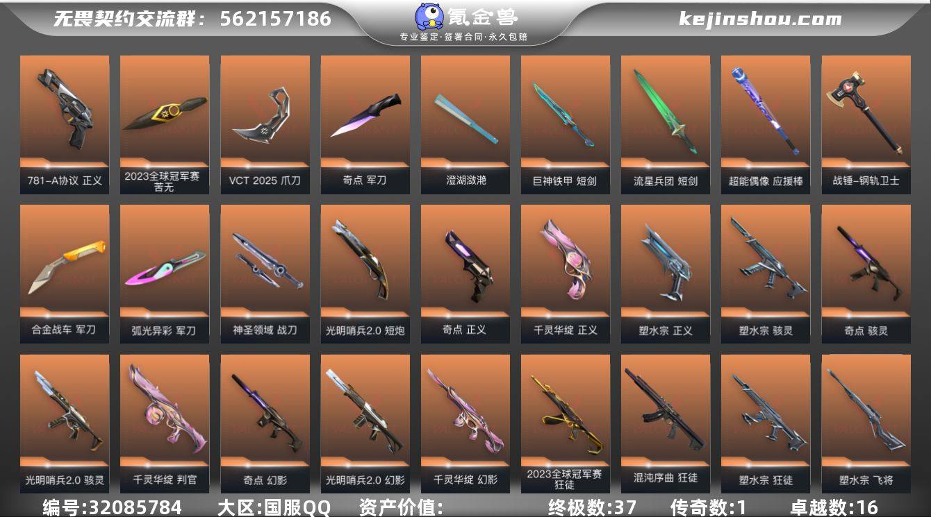 【套装】:离火刃套装,2023全球冠军赛套装,VCT 2025 赛季套装,塑水宗套装,离火刃套装,千灵华绽套装,光明哨兵//2.0套装,奇点套装,盖亚的复仇套装,盖亚的复仇//2.0套装,天界神兵套装,耀鳞威龙套装,巨神铁甲套装 【英雄】:幻棱,炼狱,维斯,暮蝶,钛狐,壹决,铁臂,捷风,雷兹,幽影,不死鸟,贤者,猎枭,蝰蛇,零,芮娜,奇乐,尚勃勒,霓虹,斯凯,夜露,星礈,K/O,海神,盖可,黑梦,钢锁 【近战武器】:近战武器-2023全球冠军赛 苦无,近战武器-VCT 2025 爪刀,近战武器-离火刃,近战武器-黑波之刃,近战武器-奇点 军刀,近战武器-落英飞旋,近战武器-威龙之刃,近战武器-澄湖潋滟,近战武器-巨神铁甲 短剑,近战武器-流星兵团 短剑,近战武器-超能偶像 应援棒,近战武器-盖亚之怒,近战武器-盖亚之愠,近战武器-钢轨卫士 战锤,近战武器-合金战车 军刀,近战武器-弧光异彩 军刀,近战武器-圣石匕首,近战武器-天玄刀,近战武器-神圣领域 战刀 【狂徒】:狂徒-2023全球冠军赛,狂徒-混沌序曲,狂徒-塑水宗,狂徒-盖亚的复仇,狂徒-耀鳞威龙,狂徒-紫阙金琅,狂徒-超能偶像,狂徒-钢轨卫士,狂徒-弧光异彩,狂徒-巨神铁甲,狂徒-流星兵团,狂徒-沙尘幻旅,狂徒-诡秘蛇影 【幻影】:幻影-光明哨兵//2.0,幻影-奇点,幻影-千灵华绽,幻影-盖亚的复仇//2.0,幻影-合金战车,幻影-巨神铁甲,幻影-噬源兽防卫工程,幻影-珍珠棘贝,幻影-神圣领域,幻影-聚合之力,幻影-战术小伙伴 【戍卫】:戍卫-盖亚的复仇,戍卫-天界神兵,戍卫-超能偶像,戍卫-钢轨卫士,戍卫-珍珠棘贝,戍卫-彩梦之城,戍卫-花漾粉红,戍卫-萌彩剪影,戍卫-战术熊与伙伴们,戍卫-月球哨兵,戍卫-折光棱晶 【獠犬】:獠犬-弧光异彩,獠犬-神圣领域,獠犬-采蜜小蜂队,獠犬-复古浪潮,獠犬-胡桃狂想,獠犬-数码咒术,獠犬-战术小伙...