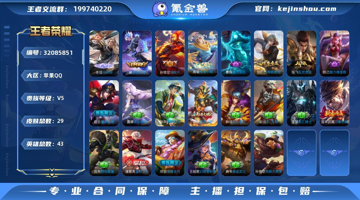 可二次【问心剑 1无双2传说可秒换绑】苹果QQ-43英雄-29皮肤【无双皮肤】问心剑【传说皮肤】逐花归海 地狱火【史诗皮肤】幽灵船长 魅力维加斯 鹰眼统帅 乱世虎臣 皇家上将【勇者皮肤】虚灵犬护 线条小狗 灵野札记 命运加冕 万象初新 街头霸王 野性能量 幻想奇妙夜 海滩派对 死亡骑士 忍·炎影 掌控之力 西部大镖客 黄金武士 营地ID:1509334682