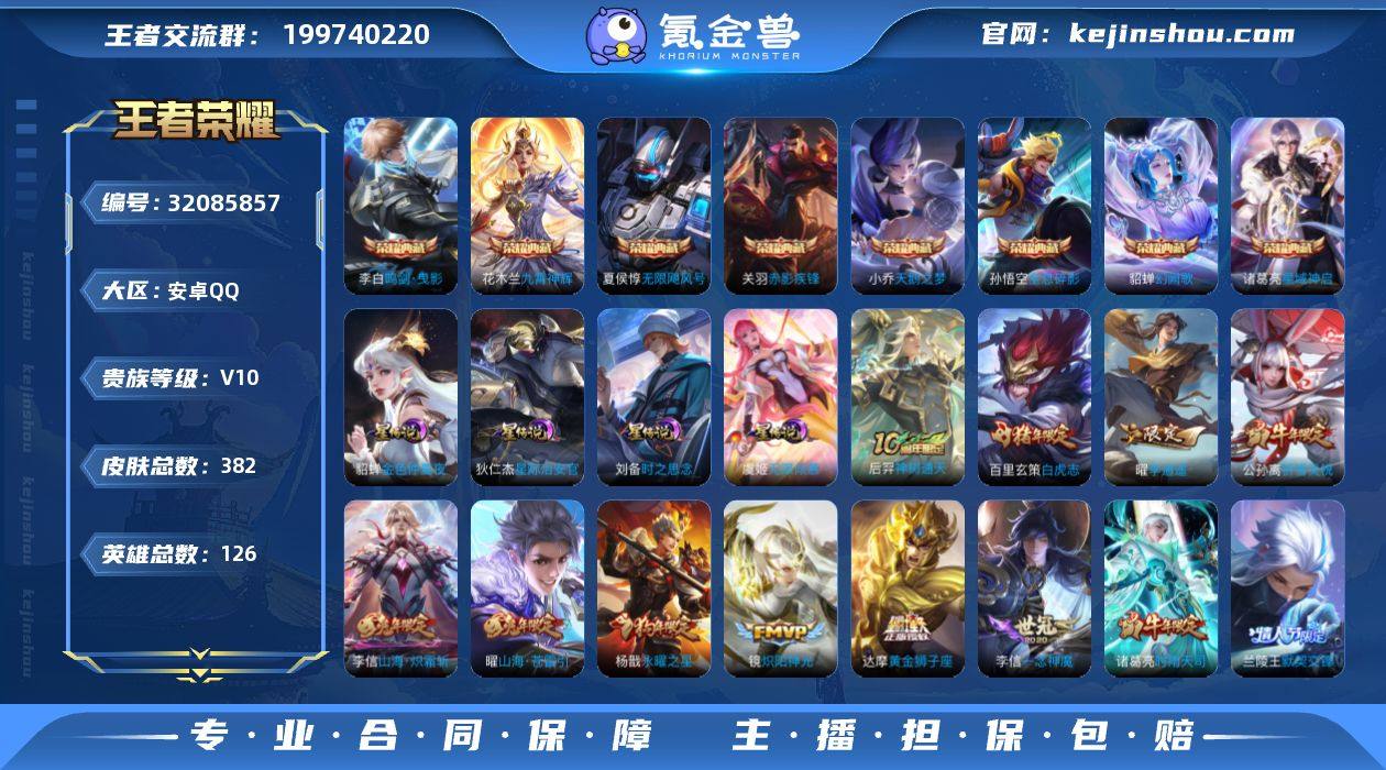 V10 8典藏 41传说 4星元 382皮肤 126英雄 【8水晶】关羽-赤影疾锋,花木兰-九霄神辉,李白-鸣剑·曳影,孙悟空-全息碎影,夏侯惇-无限飓风号,小乔-天鹅之梦,诸葛亮-星域神启,貂蝉-幻阙歌【41传说】项羽-无限倾心,虞姬-无限倾心,曜-山海·苍雷引,小乔-山海·琳琅生,孙悟空-齐天大圣,李信-山海·炽霜斩,百里守约-碎云,孙策-挚爱之约,百里玄策-白虎志,达摩-黄金狮子座,狄仁杰-超时空战士,貂蝉-仲夏夜之梦,貂蝉-遇见胡旋,干将莫邪-久胜战神,公孙离-祈雪灵祝,关羽-武圣,镜-炽阳神光,铠-绛天战甲,兰陵王-默契交锋,李信-一念神魔,刘备-时之恋人,梦奇-胖达荣荣,孙策-末日机甲,孙悟空-地狱火,孙悟空-零号·赤焰,王昭君-乞巧织情,小乔-音你心动,杨戬-永曜之星,曜-李逍遥,虞姬-云霓雀翎,虞姬-启明星使,张良-黄金白羊座,赵云-淬星耀世,周瑜-音你心动,诸葛亮-武陵仙君,诸葛亮-时雨天司,吕布-怒海麟威,东皇太一-灼幽烈阳,伽罗-炽翼辉光,艾琳-觅芳踪,后羿-神树通天【4星元】狄仁杰-星际治安官,刘备-时之思念,貂蝉-金色仲夏夜之梦,虞姬-无限倾慕【113史诗】墨子-降魔,元歌-无心,上官婉儿-神器·万象笔,鬼谷子-五谷丰年,赵云-未来纪元,钟无艳-超时空战士,艾琳-奇遇舞章,澜-赏金猎手,明世隐-吟游魔法,夏洛特-永昼,阿轲-暗夜猫娘,阿轲-节奏热浪,阿轲-迷踪丽影,安琪拉-心灵骇客,安琪拉-时之奇旅,白起-星夜王子,百里守约-特工魅影,百里守约-朱雀志,百里玄策-原初追逐者,百里玄策-热力回旋,蔡文姬-舞动绿茵,曹操-幽灵船长,嫦娥-拒霜思,程咬金-功夫厨神,妲己-女仆咖啡,妲己-魅力维加斯,大乔-猫狗日记,狄仁杰-魔术师,狄仁杰-鹰眼统帅,典韦-蓝屏警告,典韦-岱宗,貂蝉-圣诞恋歌,伽罗-箭羽风息,干将莫邪-真爱魔法,宫本武藏-鬼剑武藏,关羽-冰锋战神,韩信-飞衡,韩信-傲雪梅枪,后羿-辉光之辰,后羿-如梦令,花木兰-水晶猎龙者,花木兰-默契交锋,黄忠-烈魂,橘右...