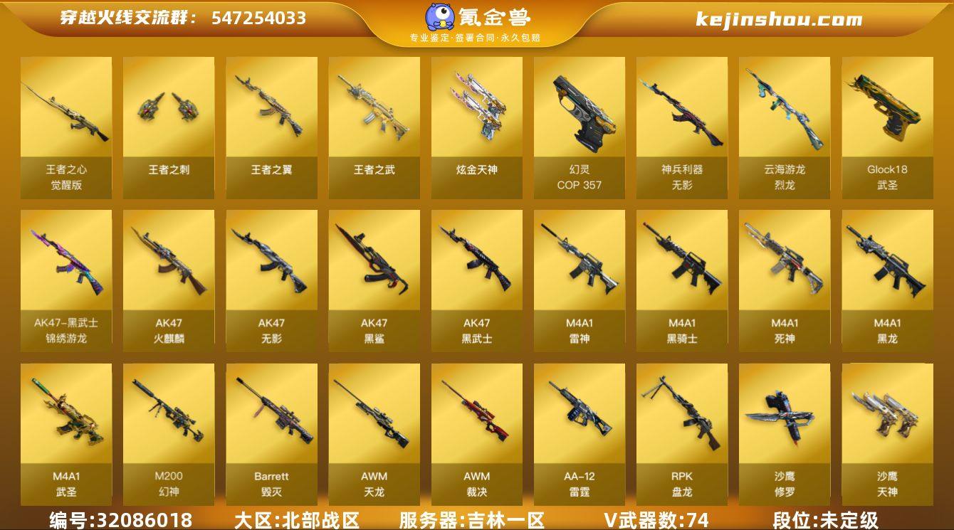 吉林一区-79V-5王者-2炫金 【热门武器】:M200-幻神,死亡之眼,M4A1-黑骑士,RPK-盘龙*6,加特林-炼狱*2,USP-雷暴,COP 357-幻灵,沙鹰-修罗*3 【王者炫金武器】:王者之翼,王者之武,王者之刺,炫金天神*2 【音效卡】:屠龙-云海游龙音效卡,AK47-火麒麟音效卡,M4A1-雷神音效卡,Barrett-毁灭音效卡 【皮肤】:幻神-冠军之幻,幻神-动感闪耀 皮肤,雷神-星空,M4A1-雷神-巅峰荣耀皮肤,火麒麟-百城,火麒麟-大唐荣光,毁灭-星空,毁灭-黑曼巴 皮肤,黑龙-暗月,黑骑士-AG-S4冠军典藏,无影耀金皮肤,战神-流金岁月皮肤,修罗-星空*2,麒麟刺-萌杀皮肤 【角色】:零,樱,瞳,岚兮儿,狐影,乔伊教练,云海玲珑,暗夜-X,风暴女*2,嘉年华灵狐,娟娟,兰-海滩派对,兰妹妹,猎狐者-追月,零-水下丽影,灵狐者-X,灵狐者-职业经理,龙儿-小淘气,麻雀,曼陀罗-X,萌儿,潘多拉-X,潘多拉-甜心教官,斯沃特-X,铁骑荣耀,新娜塔莎 【人偶武器】:M4A1-雷神-精英刀锋,天龙-乔伊教练,AWM-灵狐-15周年嘉年华,COP-旗袍,迷你裂空之翼,迷你波特博士,迷你牛牛,生化手雷-机甲核心,深渊终结者手雷,QBZ03-斯沃特 【暴走生化】:死亡之眼,超级对讲机 【挑战大师】:冰龙粉碎者-白马银枪*2,VEPR-12-金魔,激光毁灭者III,机甲撕裂者III,KAC-圣炎切割者III,神圣爆裂者-末日III,阐释者III 【英雄级武器】:AK47-火麒麟,M4A1-黑龙*4,M4A1-雷神*2,M4A1-黑骑士,AK47-无影,M4A1-死神,AK47-黑武士,M4A1-武圣,AK47-黑鲨,无影-神兵利器,黑武士-锦绣游龙,王者之心-觉醒版,AK-47-猩红传说,AWM-天龙*2,Barrett-毁灭*2,AWM-裁决,M200-幻神,RPK-盘龙*6,加特林-炼狱*2,烈龙-云海游龙,AA-12-雷霆,沙鹰-修罗*3,沙鹰-天神*2,USP-雷暴,COP 357-幻灵,Glock18-武圣,天神-动感闪耀,屠
