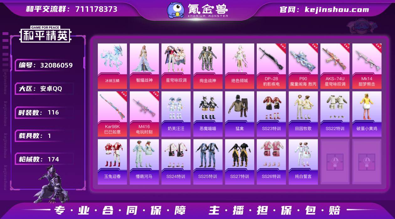 7粉装 8粉枪 1载具 116套装 174枪皮 19热门 冰绡玉鳞 绚金战神 吉莉礼服 幻羽潜行 黄色名流 牛气满满 电音精灵 熠彩粉晶 摇滚战魂 神气柴柴 柠萌假日 王牌教练 龟仙人 明鸳圣池 冷焰舞者 香榭午后 竞技名士 龙的传人 特战装甲 田园牧歌 轻风白浪 湖蓝色名流 绚烂繁星 光之冒险 街头潮人 蓝彩潮人 旭日情侣 奶芙汪汪 缤纷果语 沙漠毒蛇 幻世战舞者 热血青春 角色-智耀战神 角色-绝色倾城 星穹咏叹调 幻影飞狐 S1897-炫彩节奏 Kar98K-影袭 DBS-焰鹰斗篷 DP-28-焰鹰斗篷 汤姆逊-暗夜鎏金 GROZA-懵萌河马 AA12-G-萌物绒绒 S12K-破晓战魂 S12K-玩趣呆呆 M24-影袭 SPAS-12-田园牧歌 G36C-懵萌河马 AUG-海螺星光 AC-VAL-乌木金纹 蜜獾-天降萌叽 DP-28-彩虹符号 Mk14-治愈之星 PKM-懵萌河马 MG3-瑞龙福将 MG3-甜梦小狐 莫辛纳甘-懵萌河马 莫辛纳甘-乌木金纹 AMR-乌木金纹 S1897-暗夜鎏金 VSS-田园牧歌 VSS-彩虹符号 Mk14-乌木金纹 SLR-彩虹符号 AWM-焰鹰斗篷 G36C-暗夜玫瑰 UZI-红色方程式 Vector-焰鹰斗篷 MP5K-乌木金纹 UZI-天降萌叽 M249-破晓战魂 AKM-破晓战魂 Vector-田园牧歌 汤姆逊-天降萌叽 AKM-龙的传人 M762-萌物绒绒 P90-乌木金纹 Kar98K-红色方程式 SCAR-L-红色方程式 Kar98K-巳巳如意(5级) AKS-74U-星穹咏叹调(7级) Mk14-甜梦熊击(5级) M416-电玩时刻(5级) DP-28-豹影疾电(5级) P90-魔童闹海 敖丙 恶魔喵喵 破蛋小黄鸡 纯白誓言 SS27特训 SS26特训 SS25特训 SS24特训 SS23特训 SS22特训 SCAR-L-玉兔迎春 GROZA-田园牧歌 AUG-幻影战神 M762-彩虹符号 UMP45-蓝色火焰 DBS-彩虹符号 M249-彩虹符号 M416-蓝色火焰 长空猛禽 懵萌河马 光之冒险尾迹 镜光幻境飞行翼 炫彩糖果飞行器 灵珠游龙飞行器 提桶跑路飞行器