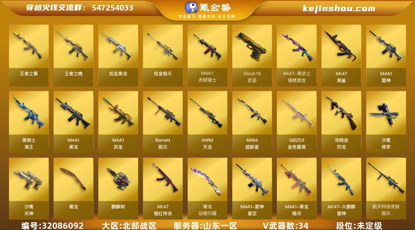 山东一区-36V-2王者-3炫金 【热门武器】:QBZ03-金色蔷薇,死亡之眼,汤姆逊-烈龙,加特林-炼狱*2,沙鹰-修罗*2 【王者炫金武器】:王者之翼,王者之魄,炫金黑龙*2,炫金毁灭 【音效卡】:M4A1-雷神音效卡,炼狱-百战金芒-庆典舞曲音效卡,死神-雪域霜狐-怀旧音效卡 【皮肤】:雷神-星空,M4A1-再燃火线,火麒麟-雷神,毁灭-暗月,毁灭-航天科技皮肤,黑龙-暗月,天龙-能量核心,炼狱-玩具枪皮肤,天神-暗月,轻型军用手斧-再燃火线 【角色】:战地猎狐,雪域霜狐,奇洋探员,乔伊教练,修道士,云海玲珑,暗夜-X,北极狐-X,初恋灵狐,芳心审判者,风暴女,嘉年华灵狐,娟娟,兰-海滩派对,麻雀,曼陀罗-X,潘多拉-甜心教官,潜龙队-X,新娜塔莎,影武者-X,智影 【人偶武器】:迷你救赎猎手,AWM-灵狐-15周年嘉年华,迷你裂空之翼*2,迷你波特博士*4,夺魂,迷你火种*2,迷你生化手雷,生化手雷-机甲核心*3,迷你艾比 【暴走生化】:死亡之眼,超级对讲机 【挑战大师】:冰龙粉碎者-白马银枪,激光毁灭者III,机甲撕裂者III,试炼破坏者III*2,KAC-圣炎切割者III,惩戒者III 【英雄级武器】:M4A1-黑龙,M4A1-雷神,AN94-超新星,M4A1-武圣,AK47-黑鲨,黑武士-锦绣游龙,Q...