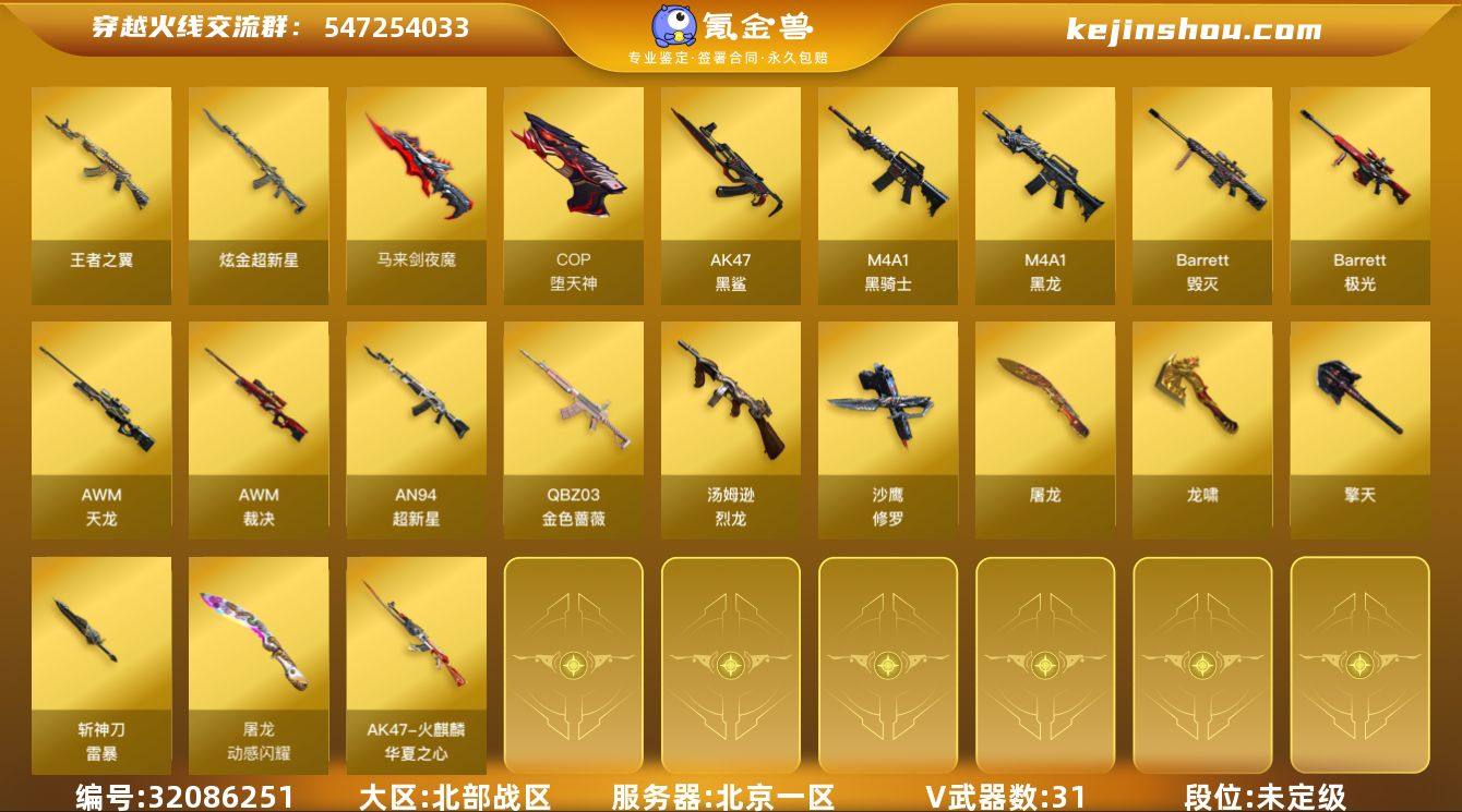 北京一区-32V-1王者武器数-1炫金武器数 【热门武器】:QBZ03-金色蔷薇,M4A1-黑骑士,汤姆逊-烈龙,COP-堕天神,沙鹰-修罗 【王者炫金武器】:王者之翼,炫金超新星 【音效卡】:AK47-火麒麟音效卡 【皮肤】:裁决-胜者为王 皮肤,火麒麟-华夏之心 【角色】:风暴女,娟娟,灵狐者-七夕宝贝,潘多拉-X,潘多拉-甜心教官 【人偶武器】:COP-旗袍 【挑战大师】:阐释者III 【英雄级武器】:M4A1-黑龙,M4A1-黑骑士,AN94-超新星,AK47-黑鲨,QBZ03-金色蔷薇,AWM-天龙,Barrett-毁灭,Barrett-极光,AWM-裁决,汤姆逊-烈龙,沙鹰-修罗,COP-堕天神,屠龙,龙啸*2,马来剑-夜魔,擎天,斩神刀-雷暴,高爆手雷-雷霆,高爆手雷-雷暴,高爆手雷-夜魔,闪光弹-雷霆,闪光弹-雷暴,闪光弹-夜魔,烟雾弹-雷霆,烟雾弹-雷暴,烟雾弹-夜魔 【道具】:CFS限定背包,战舰背包,炫彩背包,绿色巨人,灵魂忍者,迷雾幽灵,夺命之镰,防化服*2,金色流光-枪王排位,防弹头盔*2,防弹衣*2,C4工具钳*2,手雷包*2 【特殊枪械】:1黑骑士,1烈龙