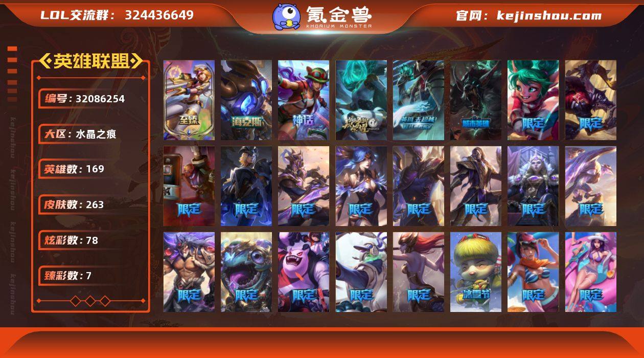 黄金段位-169英雄-263皮肤-78炫彩-0终极-5神话-24限定-17传说-71史诗【神话皮肤】:源代码乐芙兰,十五周年纪念希维尔,神凰行者瑞羽圣凰艾尼维亚,海克斯科技阿木木,至臻电玩女神凯特琳【至臻皮肤】:至臻电玩女神凯特琳【臻彩皮肤】:赵云子龙炫金将军,泳池派对凯特琳粉红冰川,霸天巨兽雪崩墨菲特,灵魂莲华亚索霜见之时,魔女阿卡丽虚荣,净雪之月莫甘娜冬虹【年限皮肤】:龙马烈焰波比【海克斯皮肤】:海克斯科技阿木木【冰雪限定】:圣诞开心鬼提莫,圣诞狂欢努努和威朗普,圣诞老人古拉加斯【限定皮肤】:地底世界崔斯特,冠军之血希瓦娜,暗杀星努努和威朗普,SSW锤石,SKTT1娜美,胜利之剑亚托克斯,胜利枪神卢锡安,胜利女神瑟庄妮,胜利凤凰艾尼维亚,胜利之王泰达米尔,胜利巨口克格莫,胜利女神娑娜,胜利剑圣易,泳池派对菲奥娜,泳池派对凯特琳,暗影沃里克,波比的巧克力工坊,勇者阿狸,都铎王朝图奇,防暴士兵辛吉德【传说皮肤】:铁哥们儿奥拉夫,地狱之门卫士加里奥,战场女武神凯尔,钢铁之翼凯尔,提莫约德尔人的一大步,合金巨兽努努和威朗普,绅士科加斯,黯晶凤凰艾尼维亚,冰霜之刃艾瑞莉娅,陆地王者4WD布里茨,冰川巨兽墨菲特,战斗学院伊泽瑞尔,腥红之月鬼武姬阿卡丽,死亡骑士盖伦,星之守护者拉克丝,焰尾妖狐阿狸,霸天异形卡兹克【史诗皮肤】:皇家火枪手崔斯特,圣光审判凯尔,天人合一易,侍魂易,铁血剑豪易,地狱火阿利斯塔,战争机器赛恩,战场公主希维尔,钢铁之心希维尔,圣洁化身索拉卡,火箭达人崔丝塔娜,法国皇室厄运小姐,国王泰达米尔,刀锋女王莫甘娜,炼金狂士辛吉德,死神卡尔萨斯,小小骑士阿木木,全金属狂潮拉莫斯,飞越疯人院萨科,夜行义贼艾瑞莉娅,穿着正装的恶魔维迦,绝代智将斯维因,抵抗军天使凯特琳,古墓丽影凯特琳,霸天巨兽墨菲特,无畏号墨...
