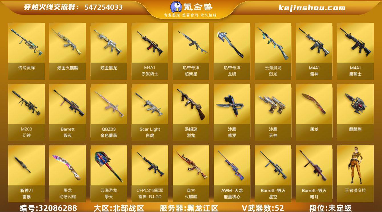 黑龙江区-69V-20王者武器数-2炫金武器数 【传说武器】:传说灵眸 【热门武器】:传说灵眸,QBZ03-金色蔷薇,Scar Light-白虎,M200-幻神,QBZ03-街机,M4A1-黑骑士,汤姆逊-烈龙*5,雷神-小红,沙鹰-修罗*2,柯尔特-赛博朋克 【王者炫金武器】:炫金火麒麟,炫金黑龙 【音效卡】:Barrett-毁灭音效卡,Barrett-碧霄极光音效卡,炼狱-百战金芒-庆典舞曲音效卡 【皮肤】:幻神-纸灯龙皮肤,白虎-电玩粉兔皮肤,金色蔷薇-电竞之星 皮肤,雷神-R.LGD-CFPLS18冠军,M4A1-雷神-新春神龙皮肤,雷神-源计划2.0专属 皮肤,M4A1-再燃火线,雷神-神秘按键 皮肤,火麒麟-盘古,毁灭-暗月,毁灭-星空,毁灭-英雄计划 皮肤,黑骑士-破界 皮肤,天龙-能量核心,AWM-再燃火线,Barrett-金色蔷薇-蛇姬 皮肤,屠龙-惊鸿 皮肤,龙啸-蛇姬 皮肤,轻型军用手斧-再燃火线 【角色】:岚兮儿,王者潘多拉,蛇隐宗,奇洋探员,修道士,云海玲珑,电竞少女,兰-新年限定,兰妹妹,猎狐者-追月,0号玩家,零-热舞青春,零-水下丽影,灵狐-花神,灵狐者-X,灵狐者-黄金海岸,灵狐者-七夕宝贝,龙儿,麻雀,潘多拉-甜心教官,蛇姬,蜀雪,铁骑荣耀,五号兵器-赛博朋克,樱-战斗天使,游珑儿 【人偶武器】:雷神-小红,星神-炽天使,AWM-灵狐-15周年嘉年华*2,迷你深渊冰龙,迷你曼提柯尔,夺魂,迷你火种,迷你生化手雷,深渊终结者手雷,灵狐娃娃手雷 【暴走生化】:超级对讲机 【挑战大师】:神圣爆裂者III,冰龙粉碎者-白马银枪*2,试炼破坏者III,神圣爆裂者-末日III 【英雄级武器】:M4A1-雷神*2,M4A1-黑骑士,Scar Light-白虎,超新星-热带奇洋,QBZ03-金色蔷薇,王者风势-觉醒版,王者芳薇-觉醒版,Barrett-毁灭*2,M200-幻神,王者之决-觉醒版,炼狱-百战金芒,汤姆逊-烈龙*5,烈龙-云海游龙,沙鹰-修罗*2,沙鹰-天神,屠龙,麒麟刺,...
