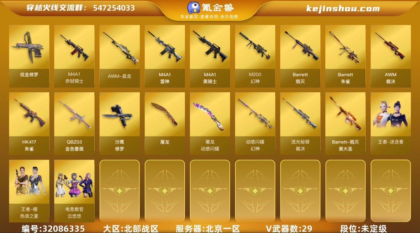 北京一区-33V-1王者-1炫金 【热门武器】:QBZ03-金色蔷薇,HK417-朱雀,M200-幻神,M4A1-黑骑士,加特林-炼狱,羊驼玩偶*3,沙鹰-修罗*2 【王者炫金武器】:炫金修罗 【音效卡】:麒麟刺-百战金芒-盛典舞曲音效卡,炼狱-百战金芒-庆典舞曲音效卡 【皮肤】:幻神-动感闪耀 皮肤,白虎-百战金芒 皮肤,金色蔷薇-纸灯龙皮肤,裁决-流光秘银,M4A1-再燃火线,雷神-神秘按键 皮肤,火麒麟-巅峰荣耀,毁灭-黑大圣皮肤*3,毁灭-虹光风暴 皮肤,修罗-星空,屠龙-春桃 皮肤,轻型军用手斧-再燃火线 【角色】:电竞教官-云悠悠,战地猎狐,王者樱-热浪之夏,王者-迷迭香,乔伊教练,初恋灵狐,芳心审判者,虎妞,嘉年华灵狐,灵狐者-X,麻雀,潘多拉-甜心教官,潜龙队-X,蛇姬,新娜塔莎,幽 【人偶武器】:迷你救赎猎手,AWM-灵狐-15周年嘉年华,M37-葵,COP-旗袍,迷你深渊冰龙,生化手雷-机甲核心,深渊终结者手雷 【暴走生化】:超级对讲机 【挑战大师】:AK47-冰龙粉碎者,冰龙粉碎者-白马银枪*2,激光毁灭者III,试炼破坏者III,神圣爆裂者-末日III 【英雄级武器】:M4A1-雷神,M4A1-黑骑士,HK417-朱雀,SCAR Light-玄豹,QBZ03-金色蔷薇,Barrett-毁灭,AWM-裁决,M200-幻神,Barrett-朱雀,加特林-炼狱,炼狱-百战金芒,沙鹰-修罗*2,Anaconda-玄豹,屠龙*2,麒麟刺-百战金芒,王者之锋-觉醒版,丛林匕首-玄豹,高爆手雷-玄豹,闪光弹-玄豹,M4A1-赤狱骑士,M4A1-苍鸣雷神,AWM-昌龙,Barrett-碧霄极光 【道具】:BS战队炫彩背包,CFS限定背包,云山科技背包,次元之矛-背包,百战金芒炫彩背包,超级背包,女皇终结者-魔龙之吻,救世主-黑桃战神,绿色巨人,灵魂忍者,迷雾幽灵*2,夺命之镰*2,防化服*3,金色流光-枪王排位,星辰流光-枪王排位,枪王排位29赛季金色流光,语音特效-盛典烟火,萌萌小葵表情,防弹头...