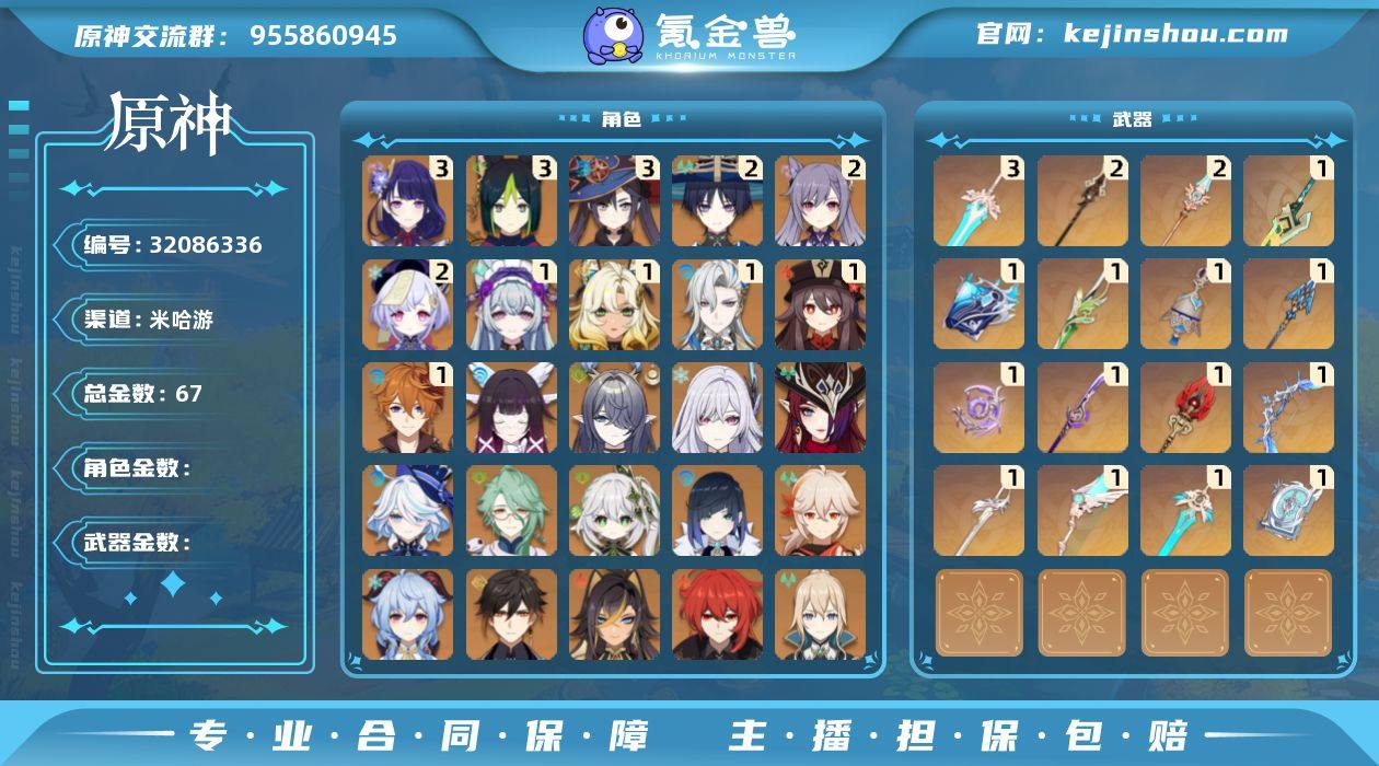 【原神】冒险等级:60,五星数量:43,五星角色:雷电将军 * 3命,莫娜 * 3命,提纳里 * 3命,刻晴 * 2命,七七 * 2命,流浪者 * 2命,希诺宁 * 1命,梦见月瑞希 * 1命,那维莱特 * 1命,达达利亚 * 1命,胡桃 * 1命,琴,白术,恰斯卡,迪希雅,钟离,夜兰,芙宁娜,丝柯克,纳西妲,菈乌玛,迪卢克,哥伦比娅,枫原万叶,甘雨__五星武器:天空之傲 * 3精,天空之脊 * 2精,贯虹之槊 * 2精,山王长牙,万世流涌大典,裁叶萃光,图莱杜拉的回忆,不灭月华,风鹰剑,护摩之杖,四风原典,天空之刃,天空之翼,薙草之稻光,冬极白星,息灾__四星角色:班尼特 * 6命,行秋 * 6命,九条裟罗 * 6命,鹿野院平藏 * 6命,珐露珊 * 6命,迪奥娜 * 6命,瑶瑶 * 6命,坎蒂丝 * 6命,托马 * 6命,烟绯 * 6命,诺艾尔 * 6命,罗莎莉亚 * 6命,菲谢尔 * 6命,北斗 * 6命,夏沃蕾 * 6命,伊法 * 6命,砂糖 * 5命,早柚 * 5命,菲米尼 * 5命,绮良良 * 3命,欧洛伦 * 3命,香菱 * 2命,柯莱 * 2命,卡维 * 2命,云堇 * 2命,五郎 * 2命,重云 * 2命,琳妮特 * 2命,夏洛蒂 * 2命,赛索斯 * 2命,卡齐娜 * 1命,久岐忍 * 1命,莱依拉 * 1命,芭芭拉 * 1命,蓝砚 * 1命,雷泽 * 1命,塔利雅 * 1命,奇偶·女性,奇偶·男性,凝光,多莉,辛焱,爱诺