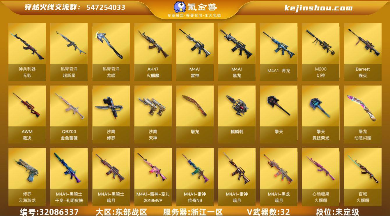 浙江一区-30V-0王者武器数-0炫金武器数 【热门武器】:QBZ03-金色蔷薇,M14EBR-玄武,M4A1-青龙,M200-幻神,沙鹰-修罗 【音效卡】:Barrett-毁灭音效卡 【皮肤】:幻神-宠儿-2021MVP,幻神-电流骇客 皮肤,雷神-暗月,雷神-传奇N9,雷神-宠儿-2019MVP,火麒麟-百城,火麒麟-心动糖果,毁灭-AG-CFPLS15冠军,M4A1-千变-孔明皮肤,黑龙-暗月,黑骑士-暗月,修罗-冠军之魂,屠龙-惊鸿 皮肤 【角色】:樱,奇洋探员,云海玲珑,暗夜-X,嘉年华灵狐,娟娟,灵动武士,灵狐-花神,灵狐者-X,灵狐者-七夕宝贝,麻雀,曼陀罗-X,曼陀罗-礼服,潘多拉-X,蛇姬,斯沃特-X,蜀雪,铁骑荣耀,兔囡囡,雪莉杨-摸金校尉,夜玫瑰-宠粉,游珑儿 【人偶武器】:COP-旗袍,迷你深渊冰龙,迷你牛魔王,迷你波特博士,深渊终结者手雷,迷你艾比,迷你巨石泰坦-魔花研究所 【暴走生化】:超级对讲机 【挑战大师】:冰龙粉碎者-白马银枪,激光毁灭者III-白马银枪 【英雄级武器】:AK47-火麒麟,M4A1-黑龙,M4A1-雷神,M4A1-青龙,M14EBR-玄武,无影-神兵利器,超新星-热带奇洋,QBZ03-金色蔷薇,Barrett-毁灭,AWM-裁决,M200-幻神,沙鹰-修罗,沙鹰-天神,修罗-云海游龙,屠龙,擎天,麒麟刺,擎天-竞技荣光,龙啸-热带奇洋,高爆手雷-雷霆,高爆手雷-竞技荣光,高爆手雷-云龙,手雷-云海游龙,手雷-热带奇洋,高爆手雷-古蛇迷踪,闪光弹-雷霆,闪光弹-云龙*2,烟雾弹-雷霆*2,烟雾弹-云龙,烟雾弹-古蛇迷踪 【道具】:CFS限定背包,云海游龙炫彩背包,奇洋探员-海龟背包,热带奇洋炫彩背包,女皇终结者-魔龙之吻,救世主-黑桃战神,绿色巨人,灵魂忍者*2,变异宝贝,迷雾幽灵*2,夺命之镰,防化服*3,金色流光-枪王排位*2,星辰流光-枪王排位,流光-再燃火线,枪王排位28赛季金色流光,枪王排位29赛季金色流光,蛇隐宗表情,热带奇洋...